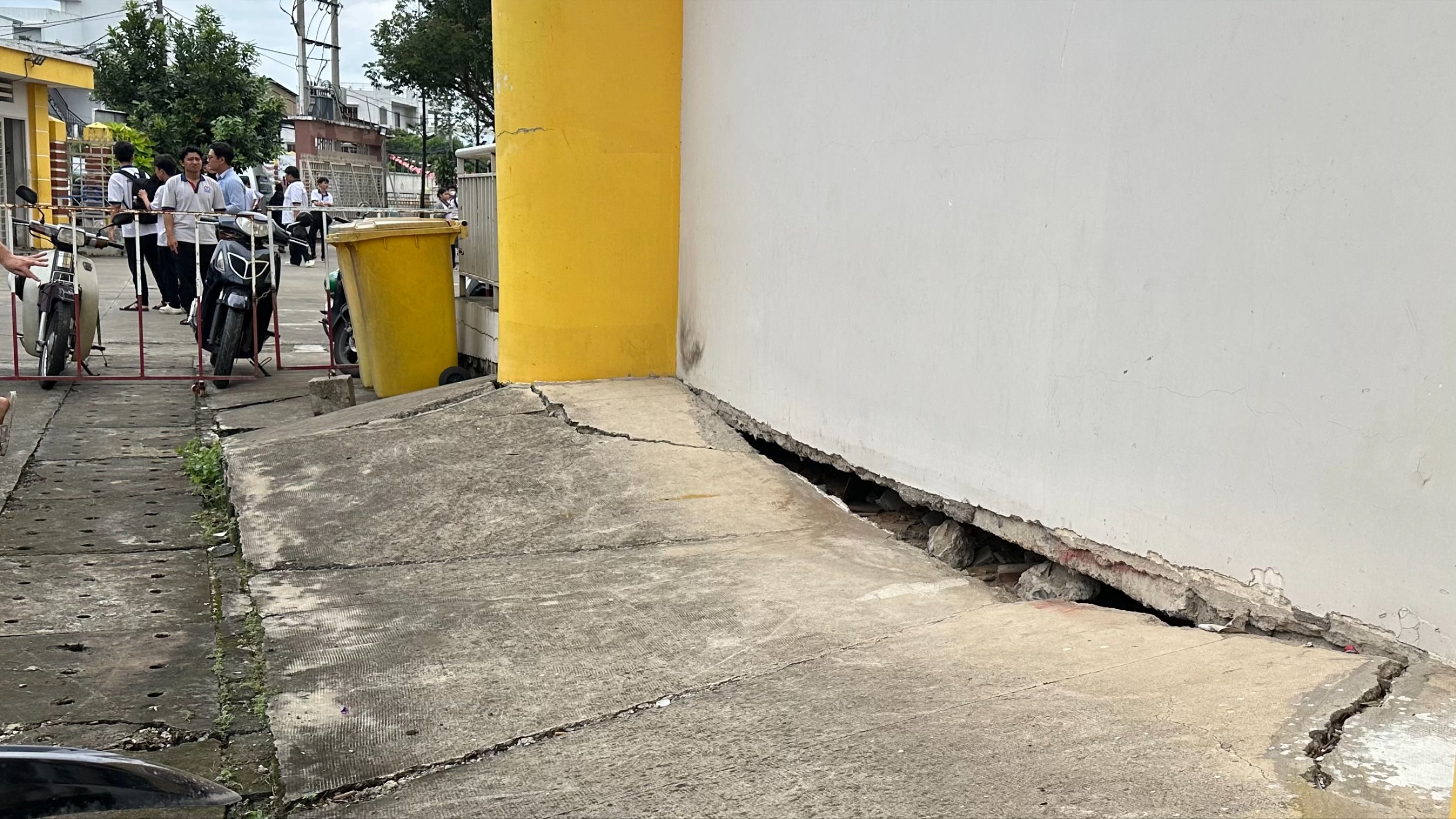 Trung tâm Văn hóa - Thể thao phường An Lạc với phần chân tường xuất hiện nhiều vết nứt lớn do nền đất lún xuống. Ảnh: THANH HIỀN