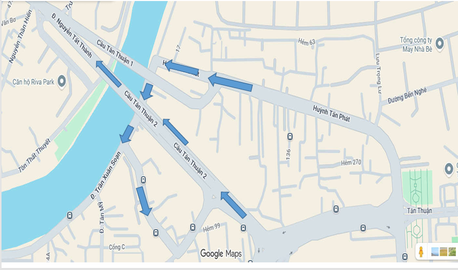 Lộ trình 2 thay thế cho các ô tô khách trên 16 chỗ, ô tô tải trên 1,5 tấn lưu thông qua cầu Tân Thuận 1: đường Huỳnh Tấn Phát - đường Trần Xuân Soạn - Nguyễn Thị Xiếu - cầu Tân Thuận 2 - đi Nguyễn Tất Thành.