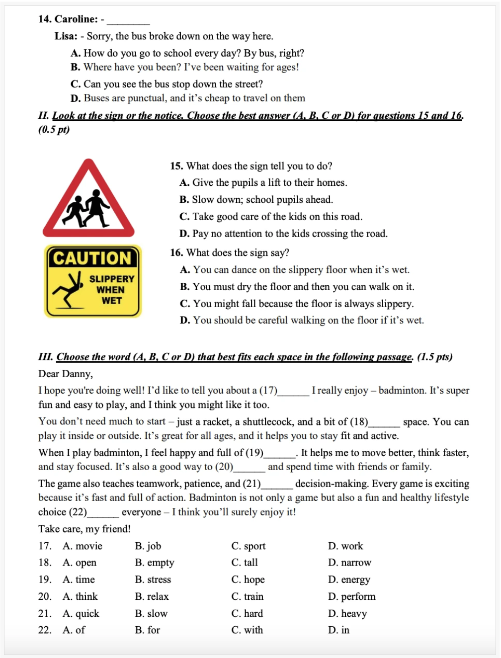 Môn thi cuối cùng là Tiếng Anh, thí sinh làm bài trong 90 phút. Đề thi có 40 câu, kiểm tra ngữ âm, từ vựng, ngữ pháp, đọc hiểu, viết, giao tiếp.