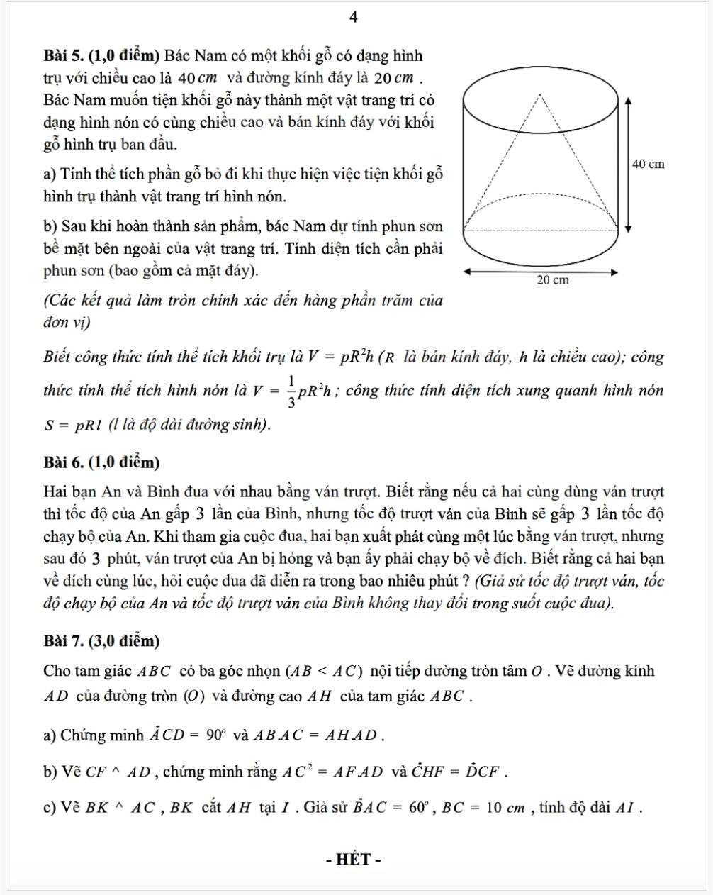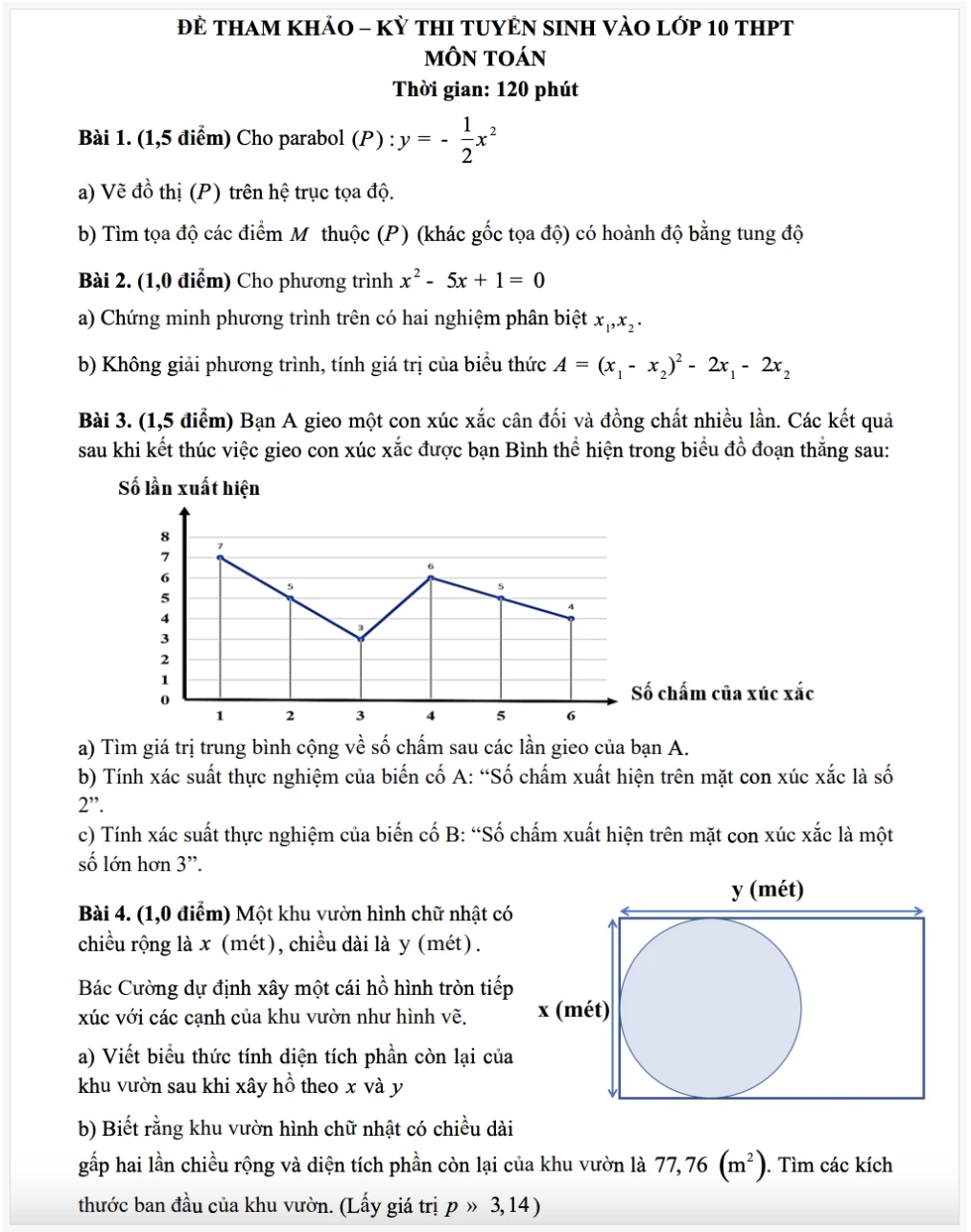 Với môn Toán, cấu trúc đề thi gồm 7 bài, mỗi bài 1-3 điểm, chủ yếu kiểm tra kiến thức về hình học và đo lường, số và đại số, thống kê và xác suất. Thí sinh làm bài trong 120 phút.