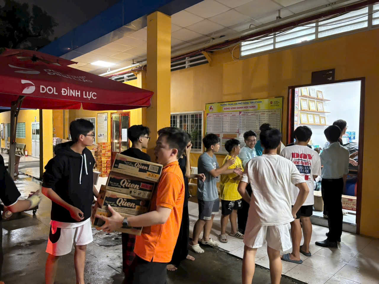 Gần nửa đêm, cán bộ, giáo viên, nhân viên và học sinh Trường THPT Ernst Thalmann (phường Bến Thành) vẫn chung tay vận chuyển nhu yếu phẩm gửi đến đồng bào miền Trung