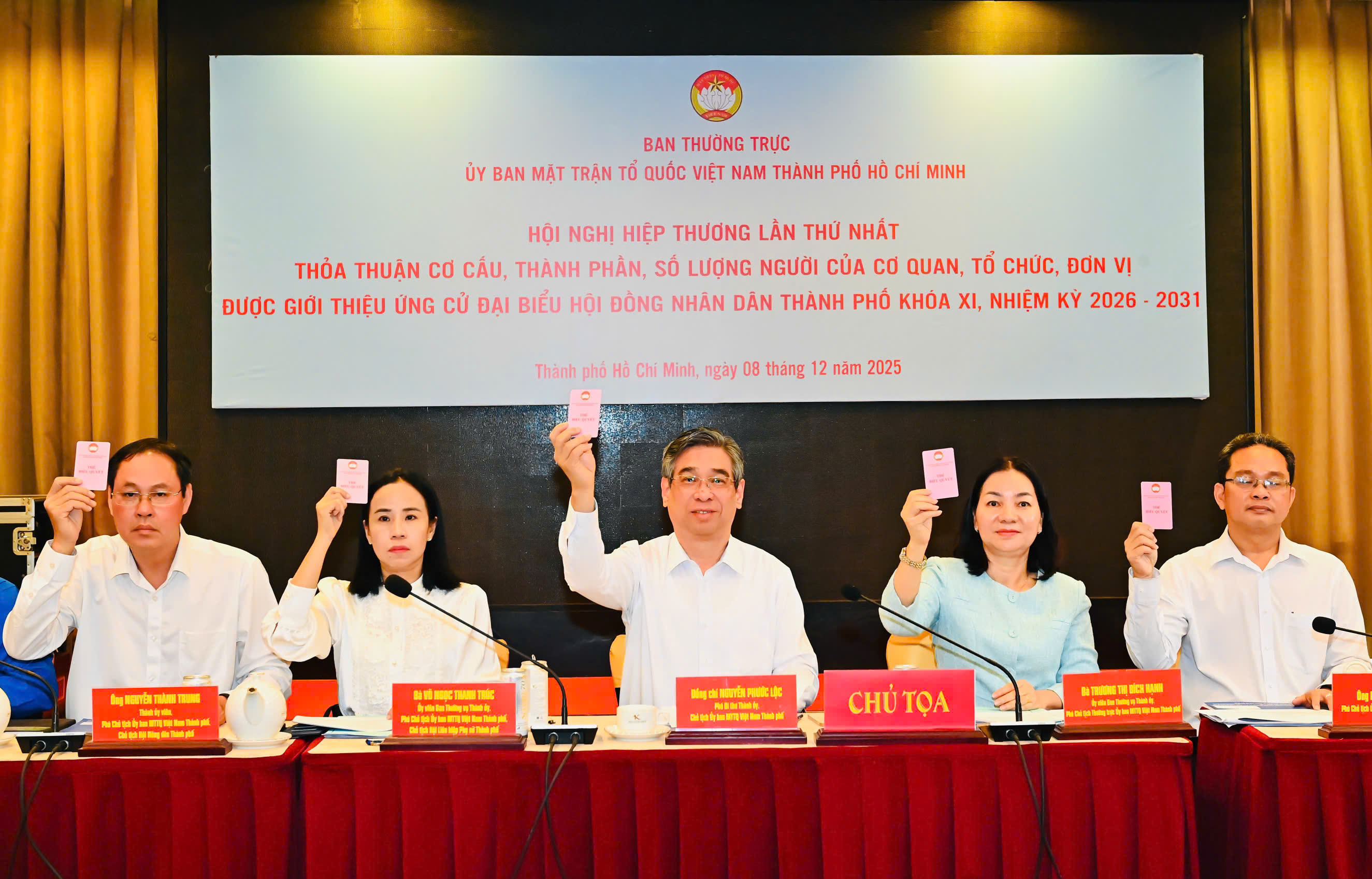 Chủ trì hội nghị có các đồng chí: Nguyễn Phước Lộc, Phó Bí thư Thành ủy, Chủ tịch Ủy ban MTTQ Việt Nam TPHCM; Trương Thị Bích Hạnh, Ủy viên Ban Thường vụ Thành ủy, Phó Chủ tịch Thường trực Ủy ban MTTQ Việt Nam TPHCM; Bùi Thanh Nhân, Ủy viên Ban Thường vụ Thành ủy, Phó Chủ tịch Ủy ban MTTQ Việt Nam TPHCM, Chủ tịch Liên đoàn Lao động TPHCM; Võ Ngọc Thanh Trúc, Ủy viên Ban Thường vụ Thành ủy, Phó Chủ tịch Ủy ban MTTQ Việt Nam TPHCM, Chủ tịch Hội Liên hiệp phụ nữ Việt Nam TPHCM.