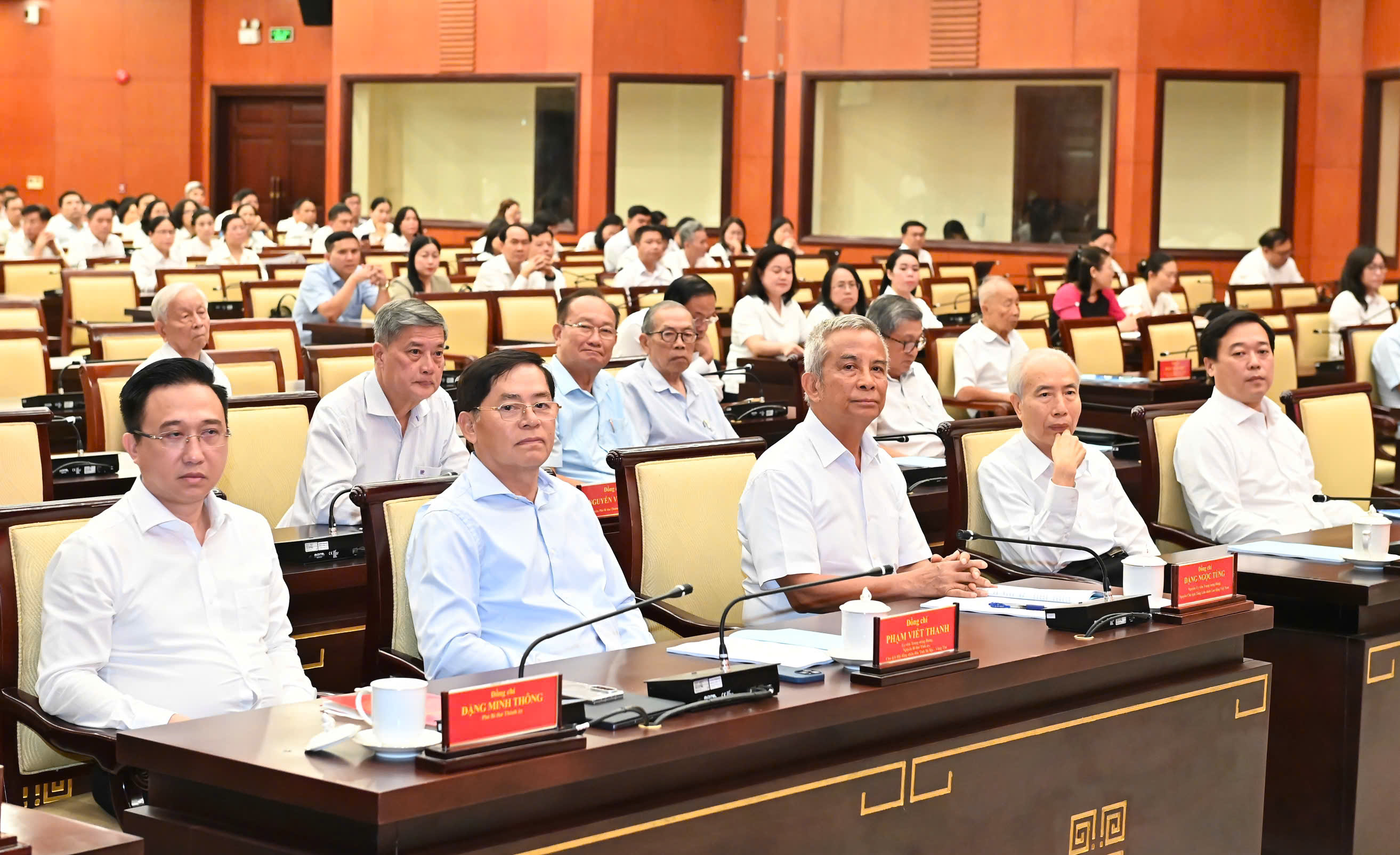 Dự hội nghị tại điểm cầu trực tiếp có các đồng chí: Trương Mỹ Hoa, nguyên Bí thư Trung ương Đảng, nguyên Phó Chủ tịch nước; Đặng Thị Ngọc Thịnh, nguyên Ủy viên Trung ương Đảng, nguyên Phó Chủ tịch nước; Huỳnh Đảm, nguyên Ủy viên Trung ương Đảng, nguyên Chủ tịch Ủy ban Trung ương MTTQ Việt Nam; Lê Quốc Phong, Ủy viên Trung ương Đảng, Phó Bí thư Thường trực Thành ủy TPHCM; Võ Văn Minh, Phó Bí thư Thành ủy, Chủ tịch HĐND TPHCM; Đặng Minh Thông, Phó Bí thư Thành ủy TPHCM; Văn Thị Bạch Tuyết, Phó Bí thư Thành ủy TPHCM. Cùng dự có các đồng chí nguyên Thường trực Thành ủy; các đồng chí Ủy viên Ban Chấp hành Đảng bộ TPHCM...