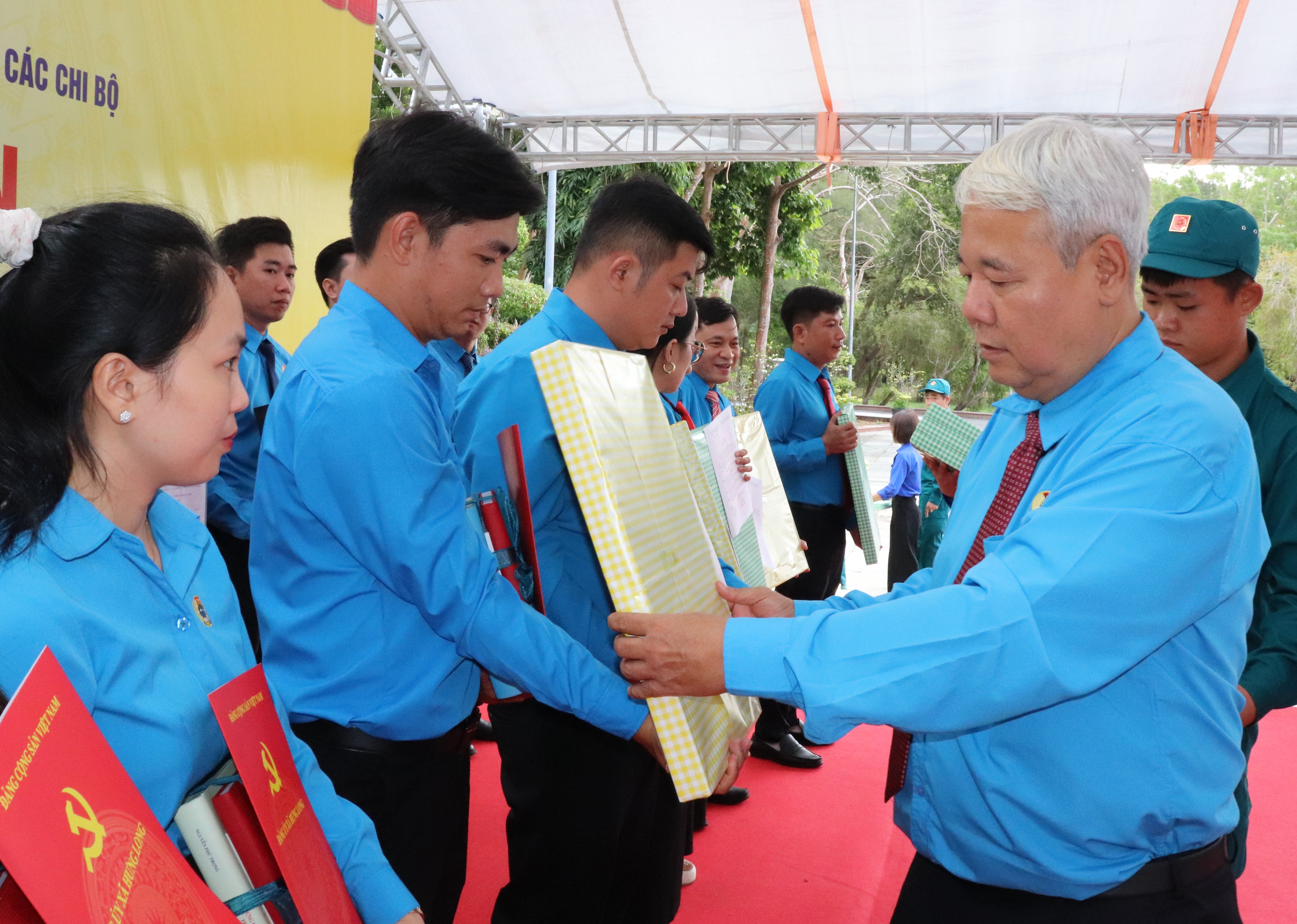 Đồng chí Võ Khắc Thái trao quà chúc mừng các đảng viên mới. Ảnh: THÁI PHƯƠNG