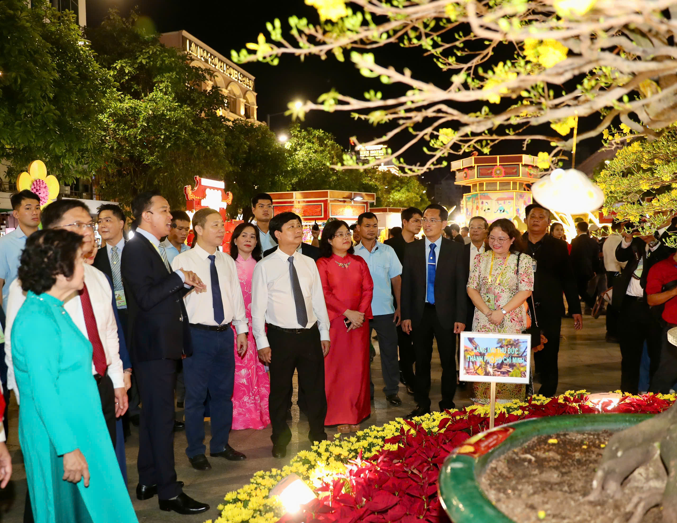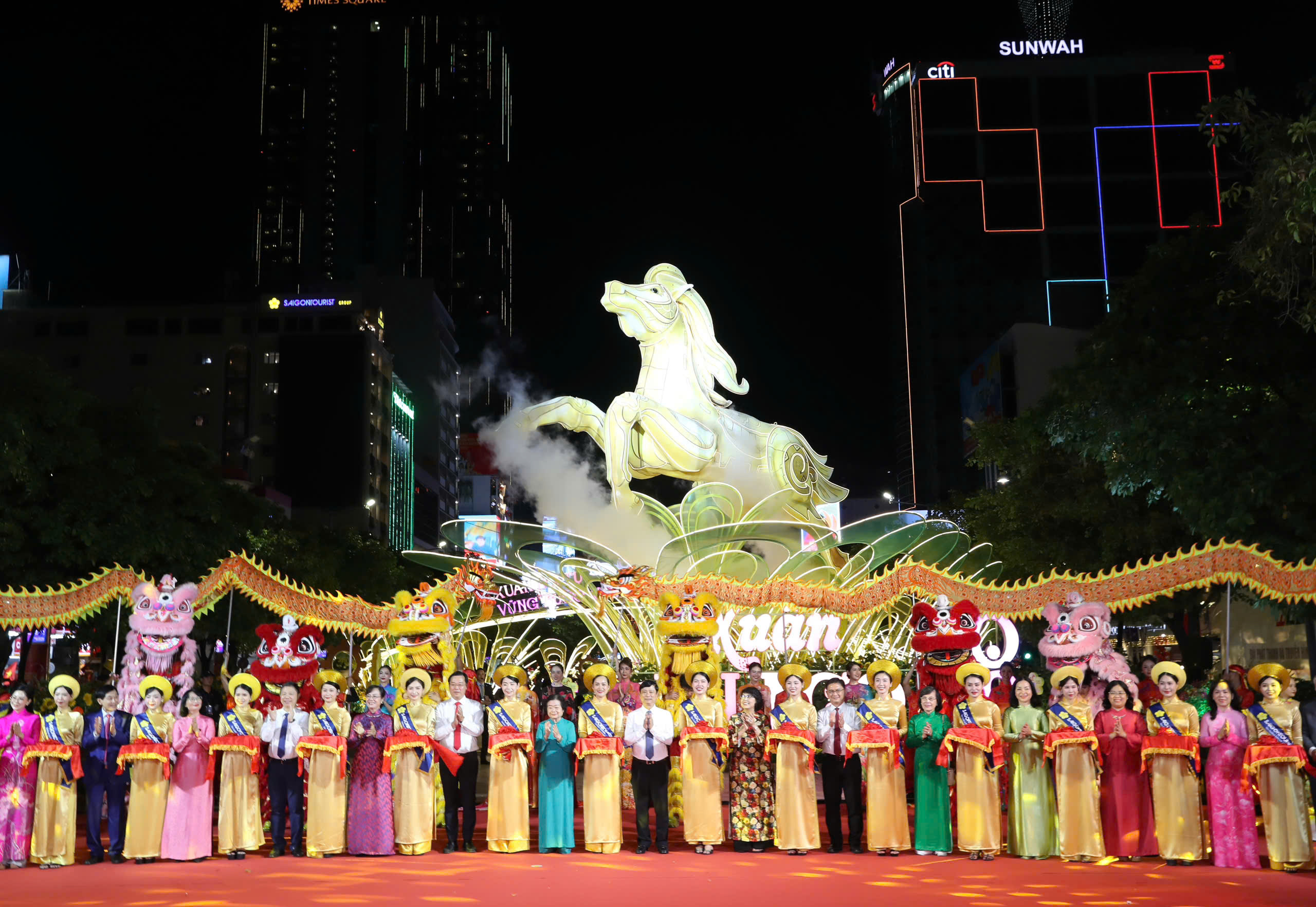 Lãnh đạo TPHCM và các đại biểu chụp ảnh kỷ niệm tại Đường hoa Nguyễn Huệ tết Bính Ngọ năm 2026. Ảnh: DŨNG PHƯƠNG