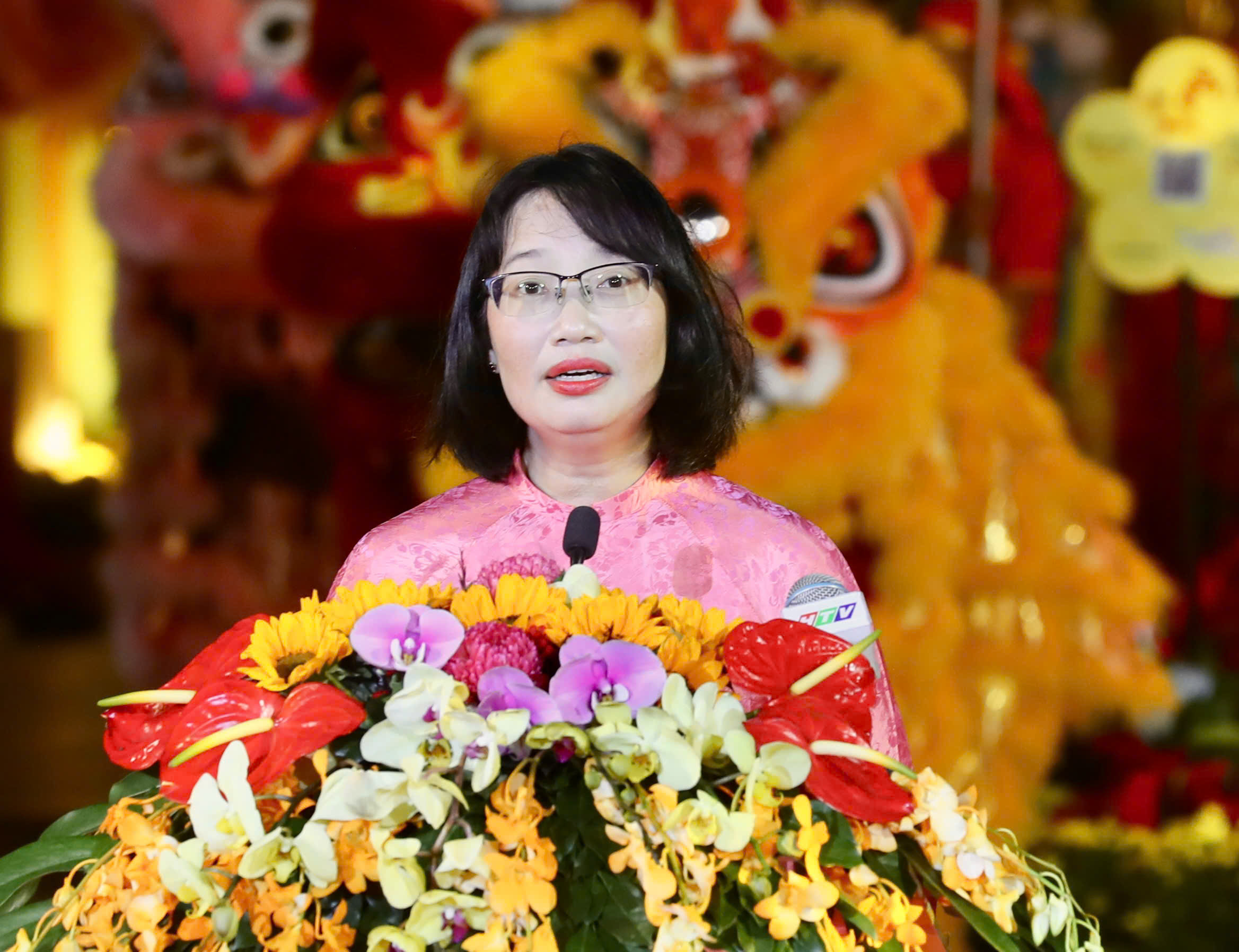 Phó Chủ tịch UBND TPHCM Trần Thị Diệu Thúy phát biểu khai mạc Đường hoa Nguyễn Huệ Tết Nguyên đán Bính Ngọ 2026. Ảnh: DŨNG PHƯƠNG