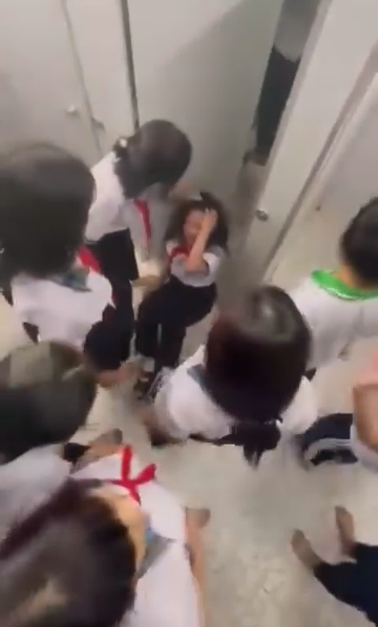 Nhóm này tát và đạp vào mặt, đạp vào bụng nữ sinh, sau đó quật ngã nữ sinh xuống đất rồi kéo đến gần một phòng vệ sinh.