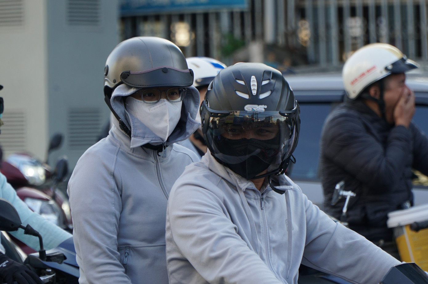 Dù thời tiết nắng ráo nhưng người dân cảm nhận được rõ rệt không khí lạnh. Người dân trùm kín khi ra đường vào sáng sớm nay.