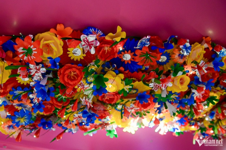 Điểm nhấn thị giác độc đáo của chuyến tàu năm nay là 1.000 cành hoa giấy ngũ sắc Thanh Tiên được trang trí tại tầng dưới. Đây là sản phẩm từ làng nghề truyền thống lâu đời tại Huế với lịch sử gần 400 năm, vốn thường dùng trang trí trong cung đình xưa mỗi dịp Tết đến xuân về.