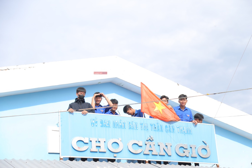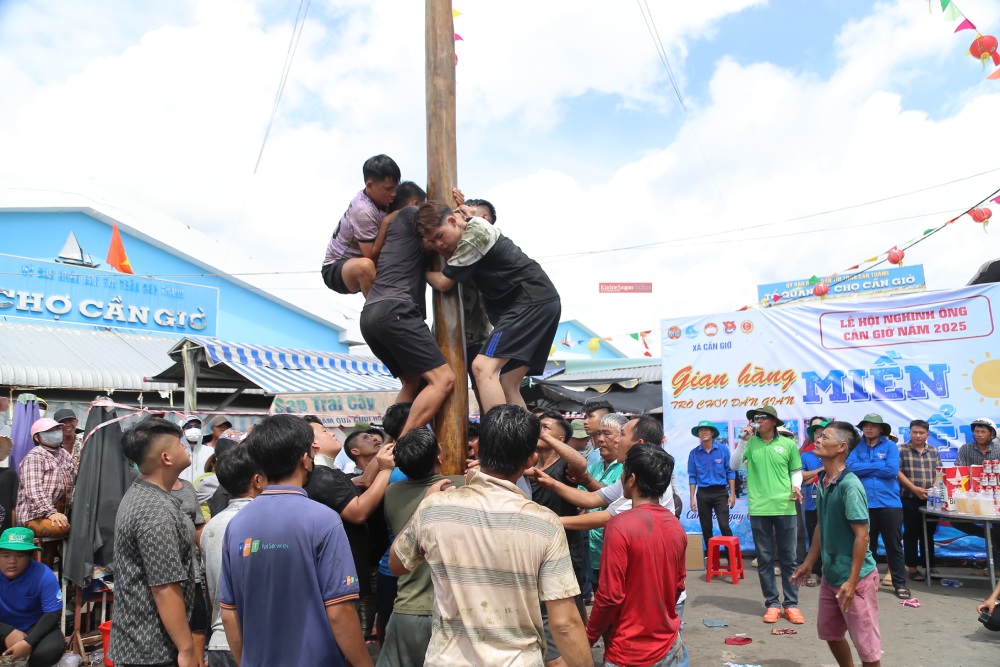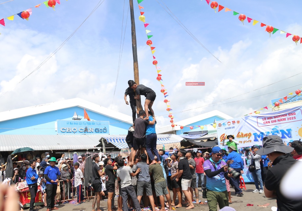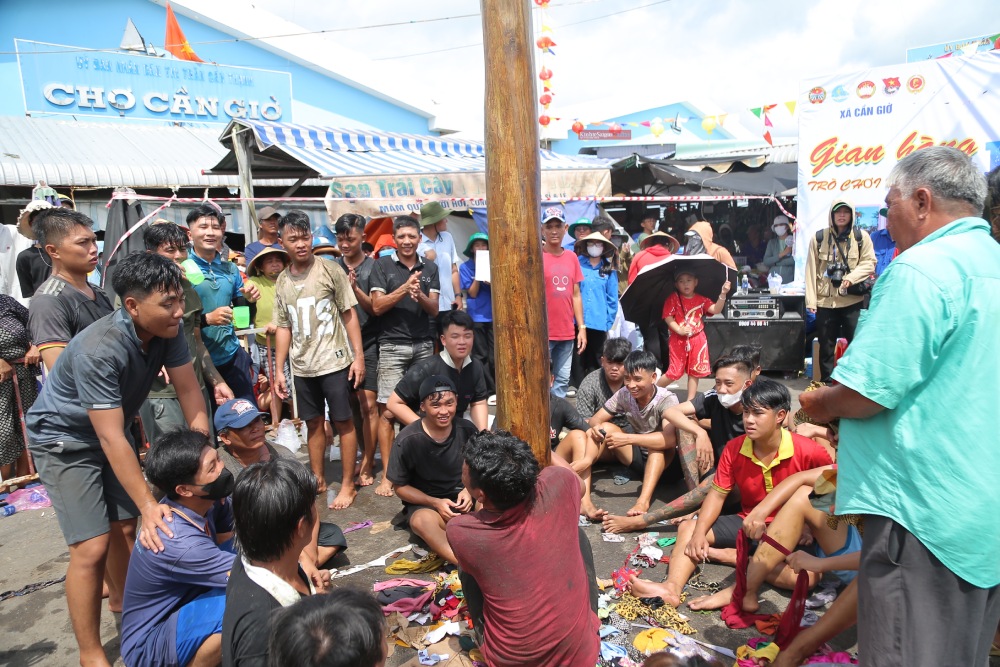 Cột mỡ cao chừng 10m được dựng giữa sân chợ Cần Giờ được hơn 20 thanh niên là các ngư dân, người dân địa phương của Cần Giờ cùng nhau phối hợp leo lên để hái lộc.