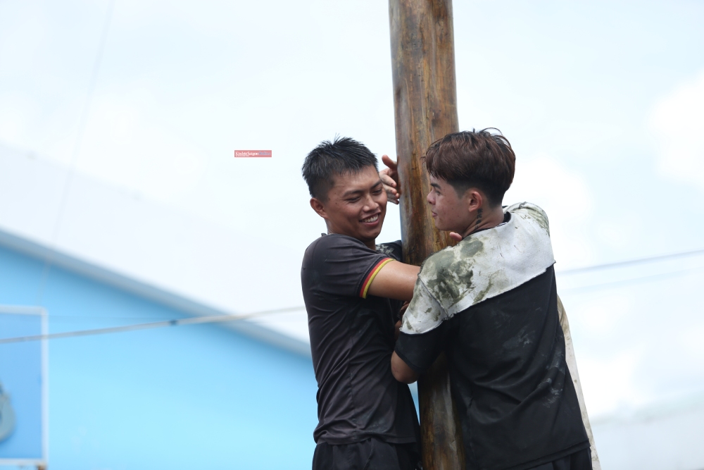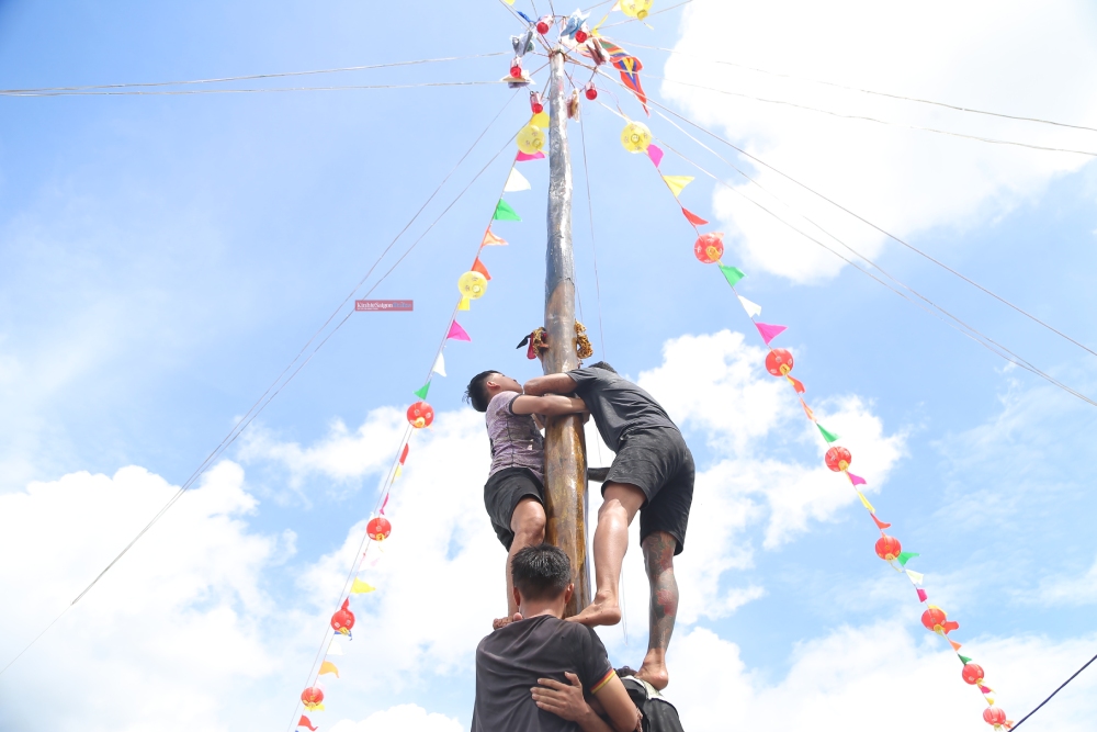 Trên thân cột được bôi mỡ bò nhằm tăng thêm độ khó để thử thách sức bền cho người tham gia.
