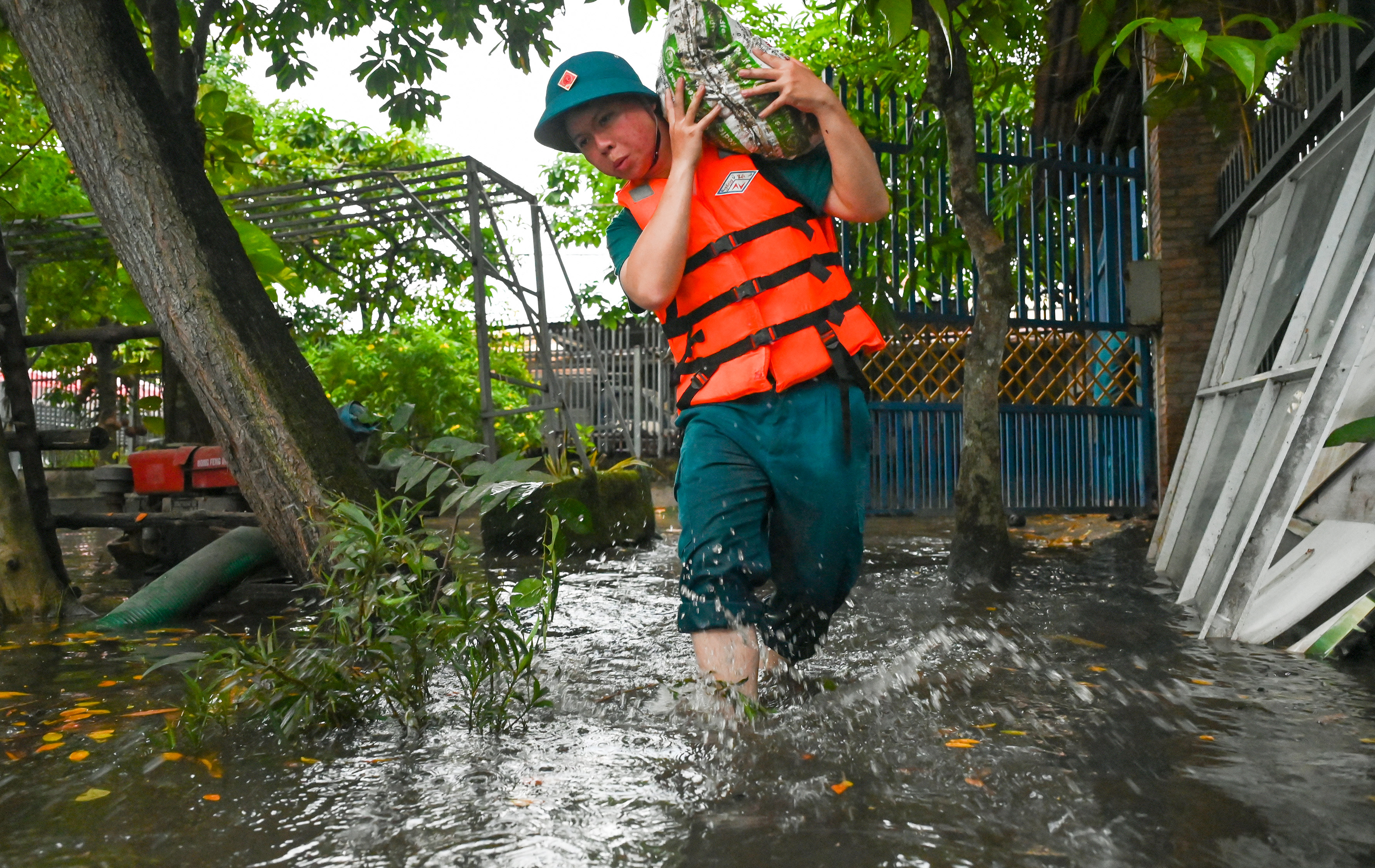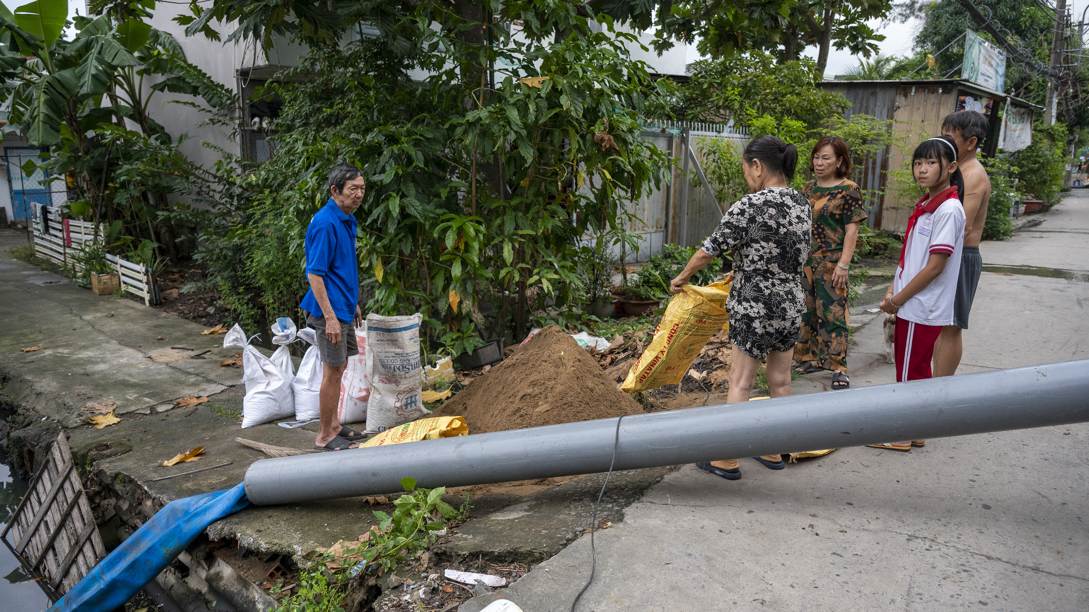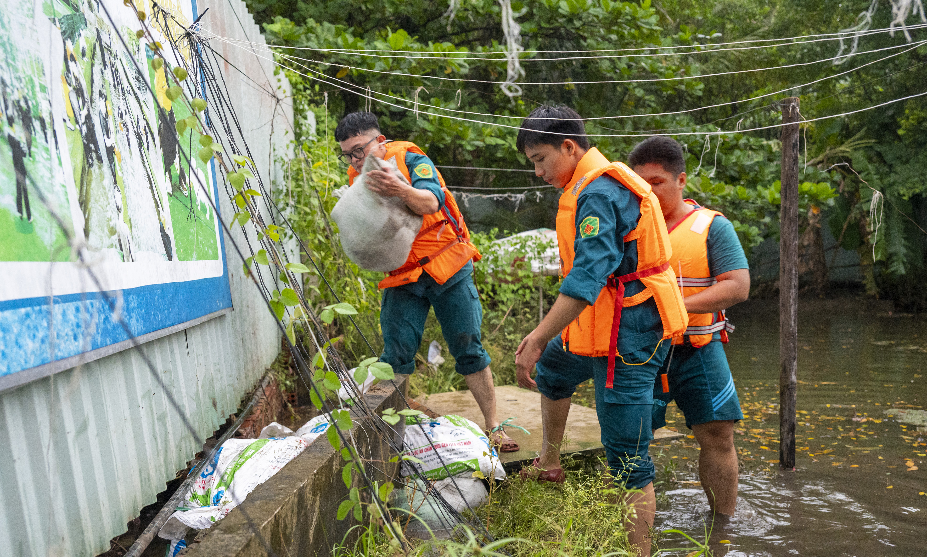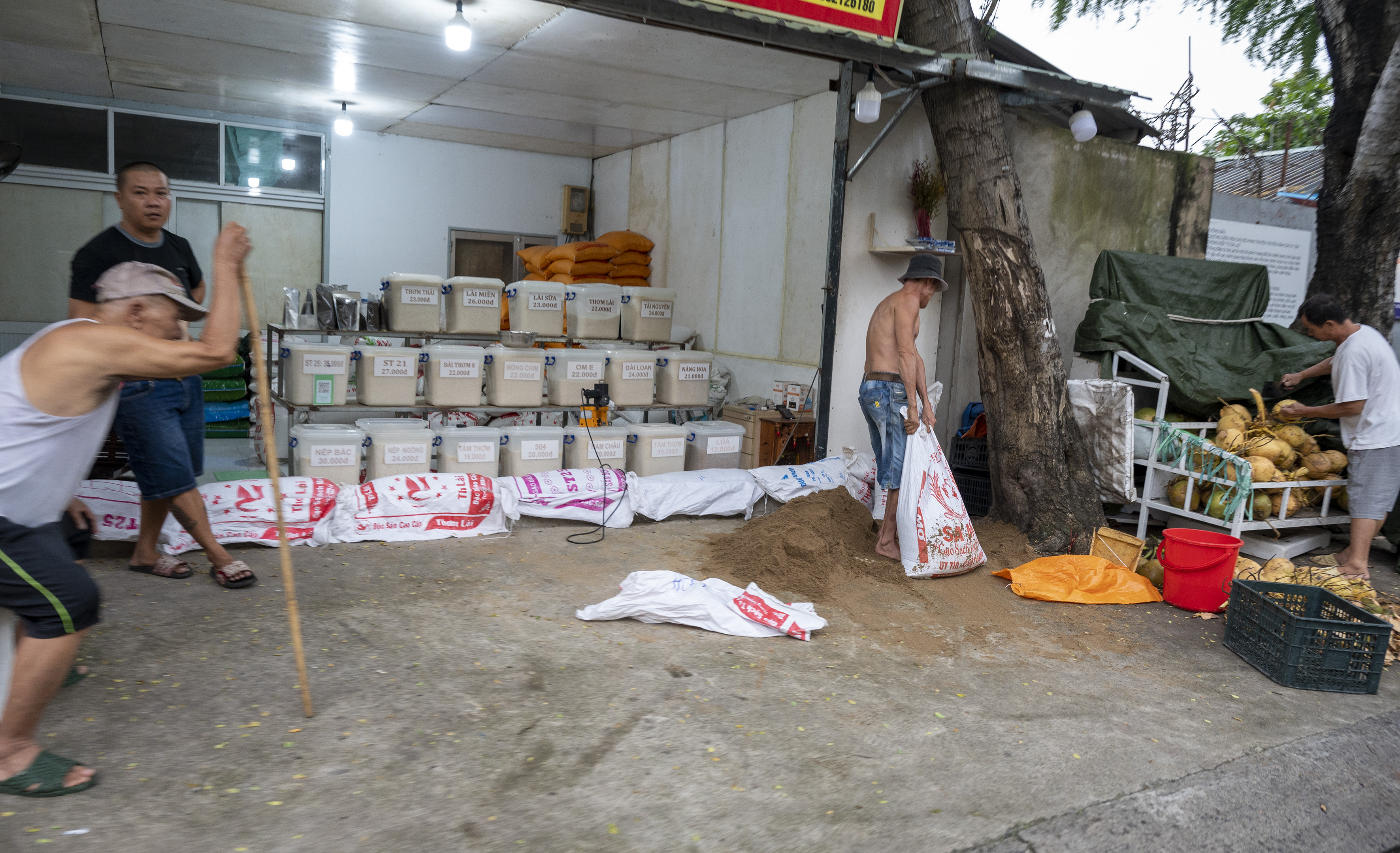 Chiều 24-10, người dân chuẩn bị bao cát, gia cố ngăn triều cường tràn vào nhà