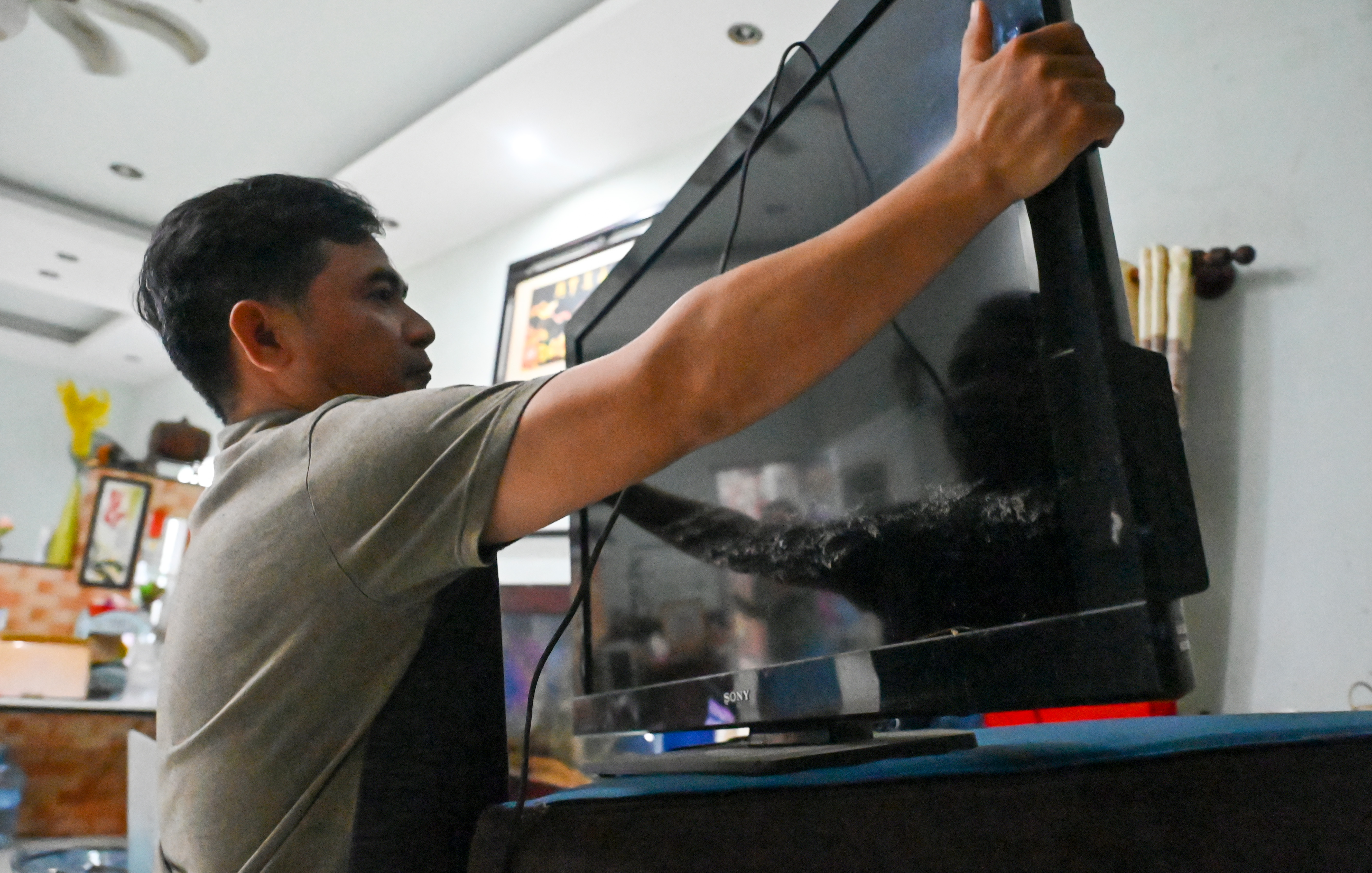 Ông Nguyễn Thủy Thạch lau dọn các thiết bị điện tử trong gia đình