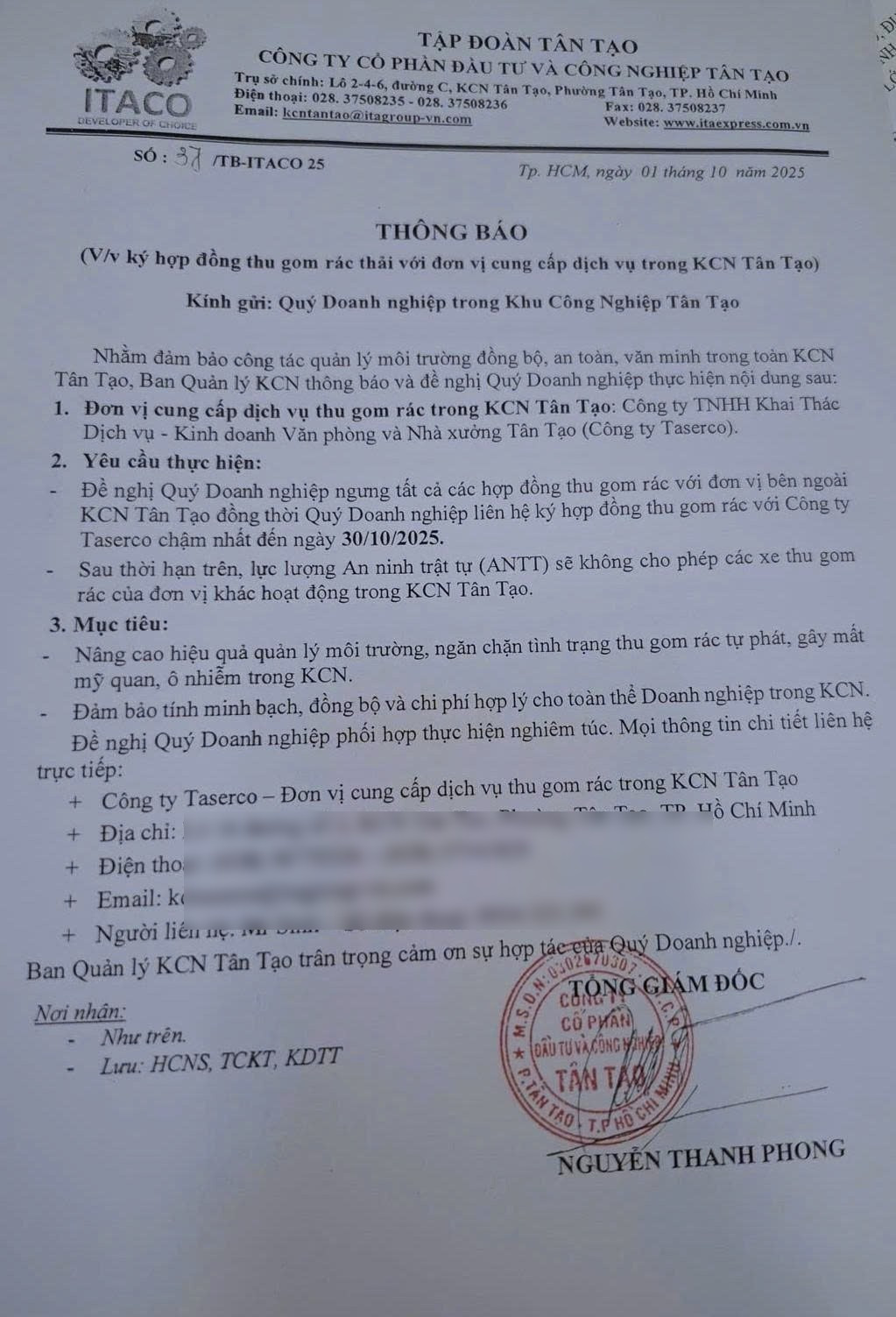 Đầu tháng 10/2025, doanh nghiệp trong Khu công nghiệp Tân Tạo (TPHCM) bất ngờ nhận được Thông báo số 37/TB-ITACO25 do Công ty Cổ phần Đầu tư và Công nghiệp Tân Tạo (Itaco) phát hành. Văn bản này yêu cầu toàn bộ doanh nghiệp trong khu phải chấm dứt hợp đồng thu gom rác với các đơn vị bên ngoài, đồng thời chỉ được ký hợp đồng với Công ty TNHH Khai thác Dịch vụ – Kinh doanh Văn phòng và Nhà xưởng Tân Tạo (Taserco) – một đơn vị thành viên của Itaco.