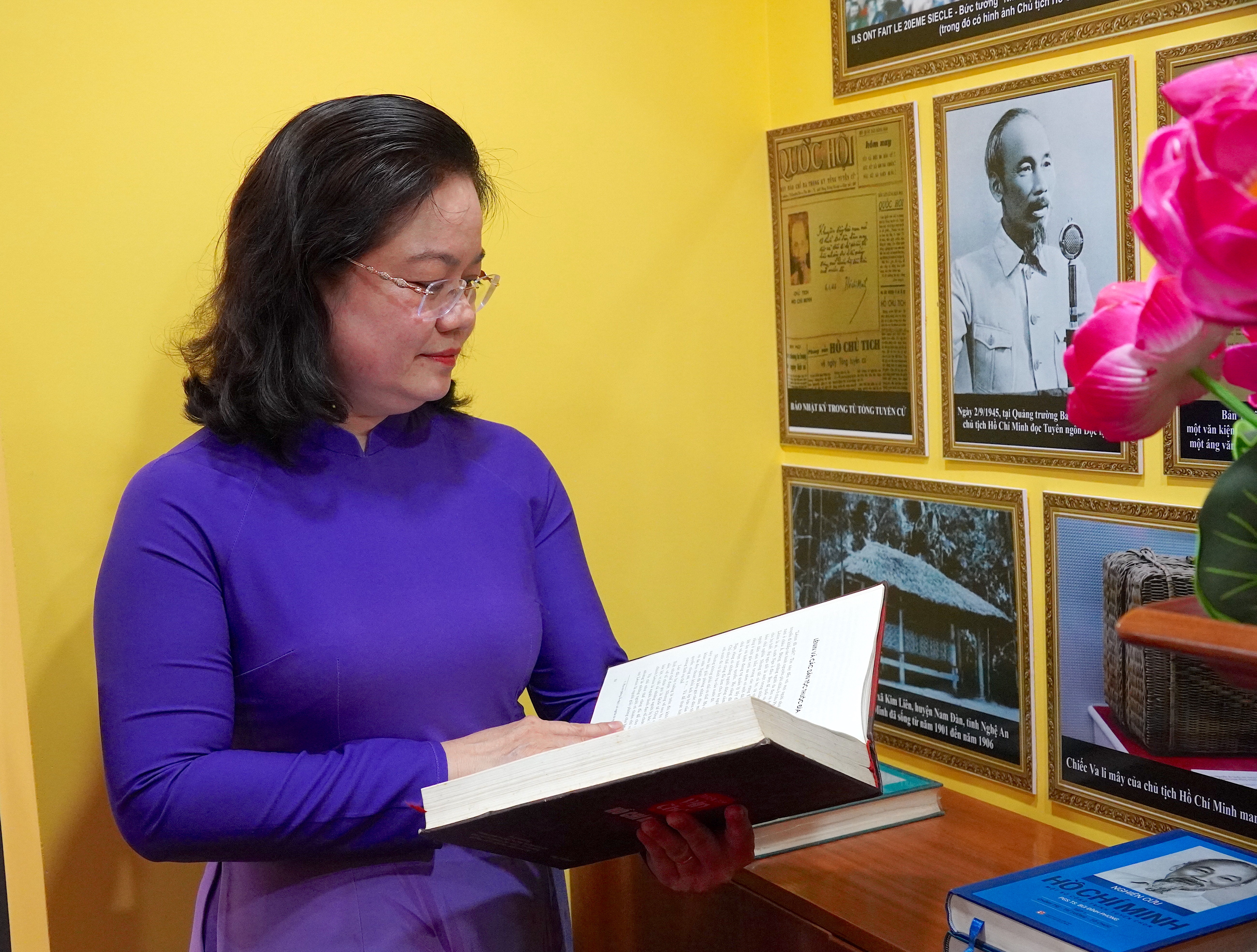 Đồng chí Nguyễn Thị Mỹ Hằng tìm hiểu các tư liệu về Bác
