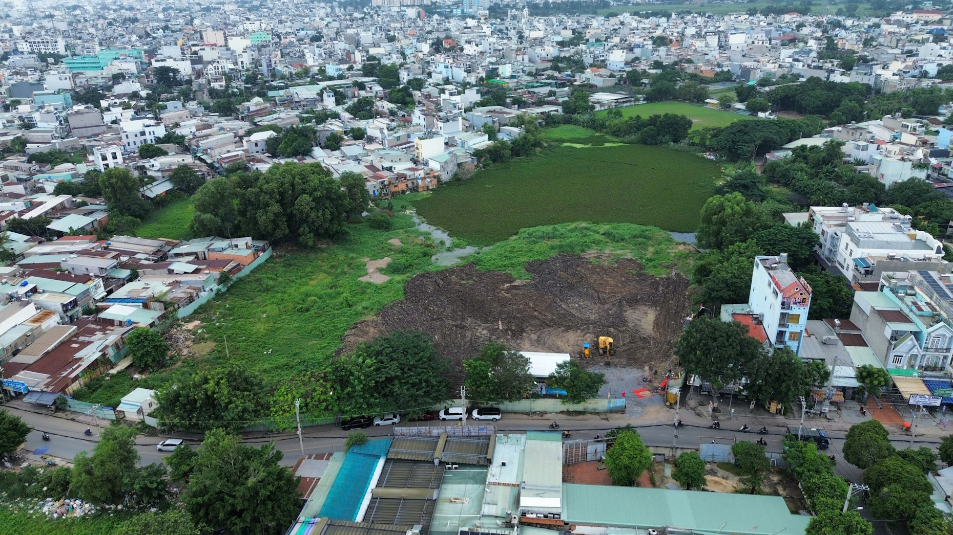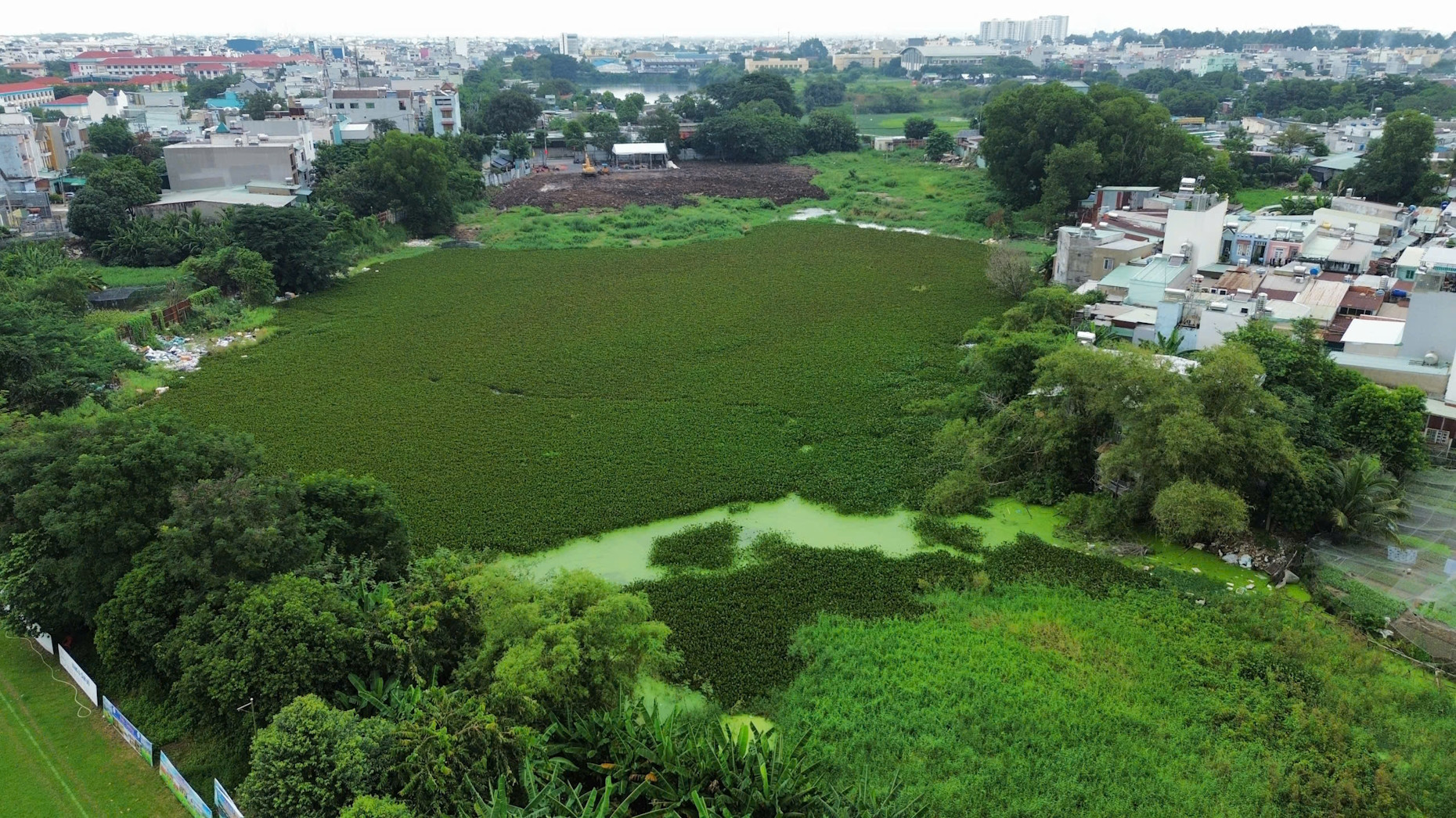 Khu vực ao cá Tân Chánh Hiệp được bao quanh bởi khu dân cư đông đúc. Ảnh: TK