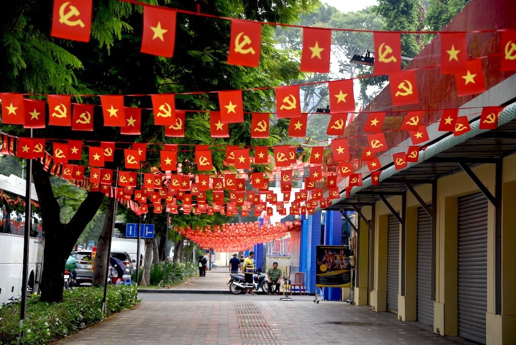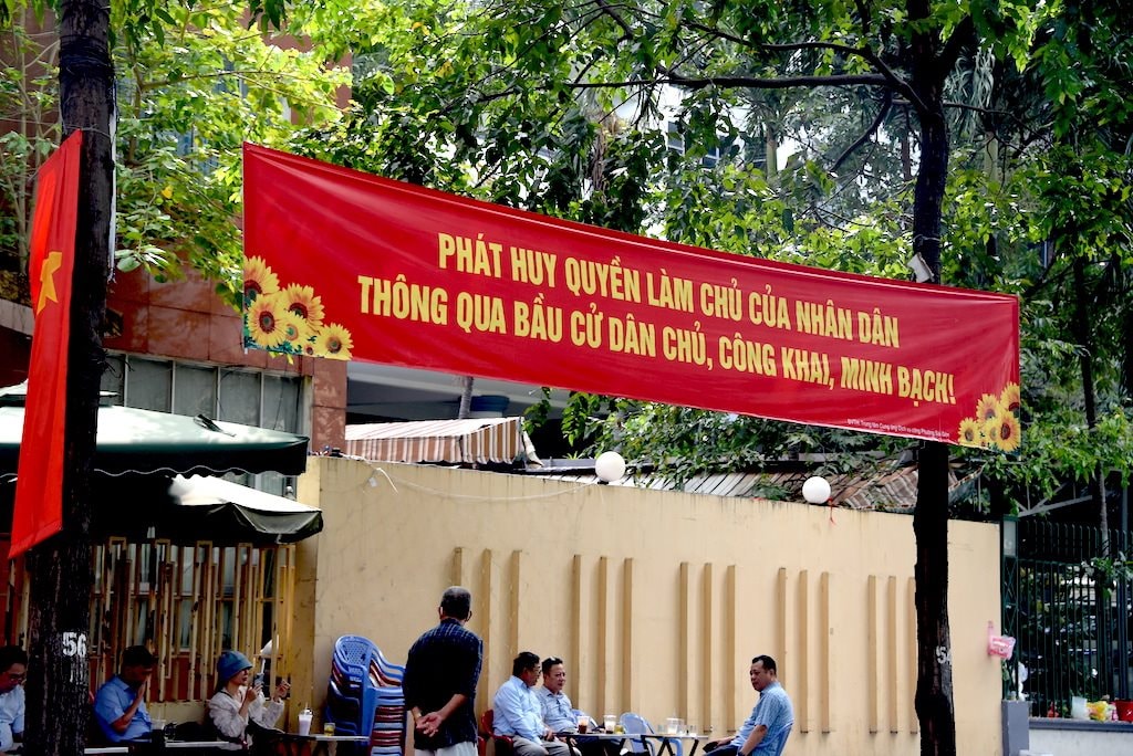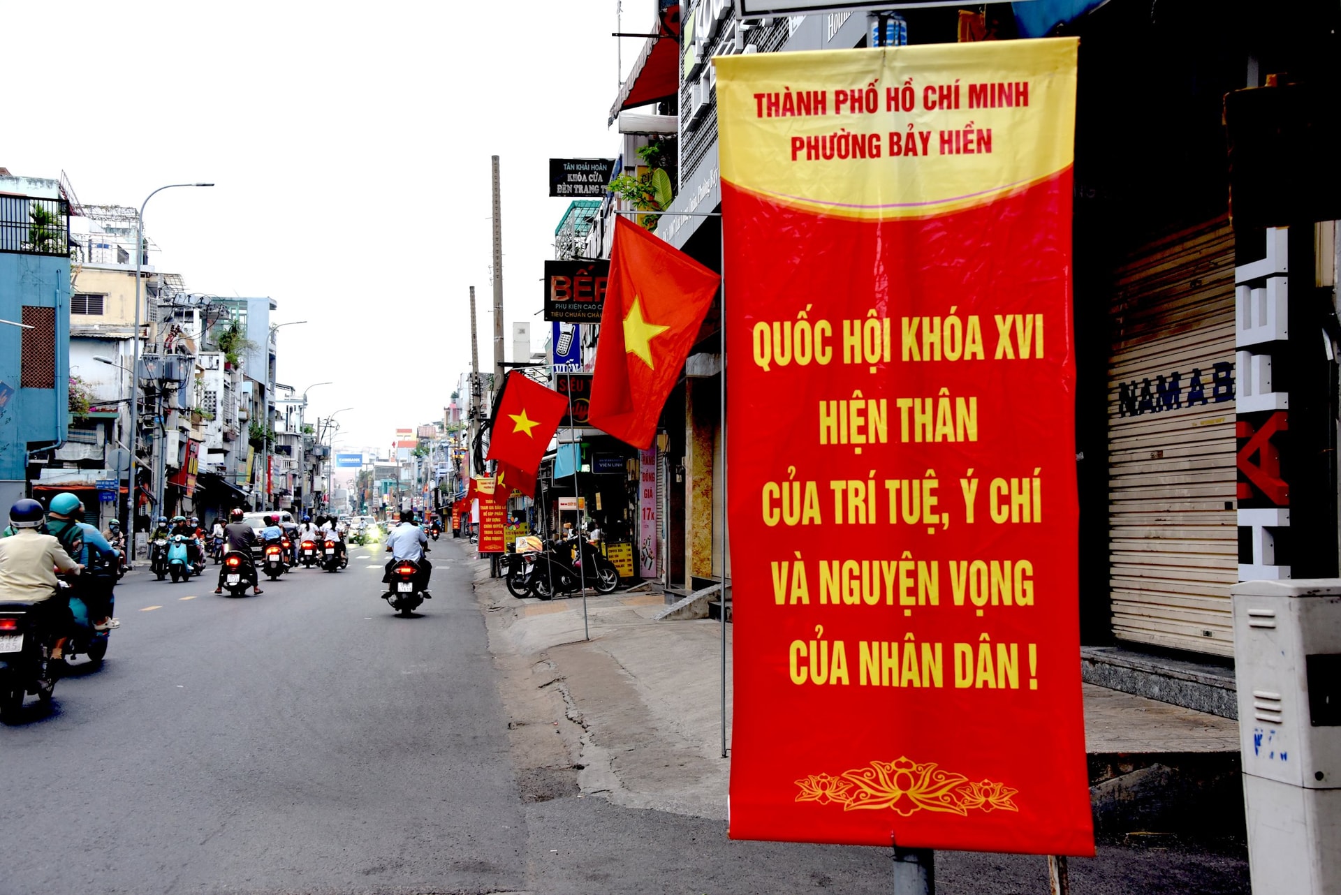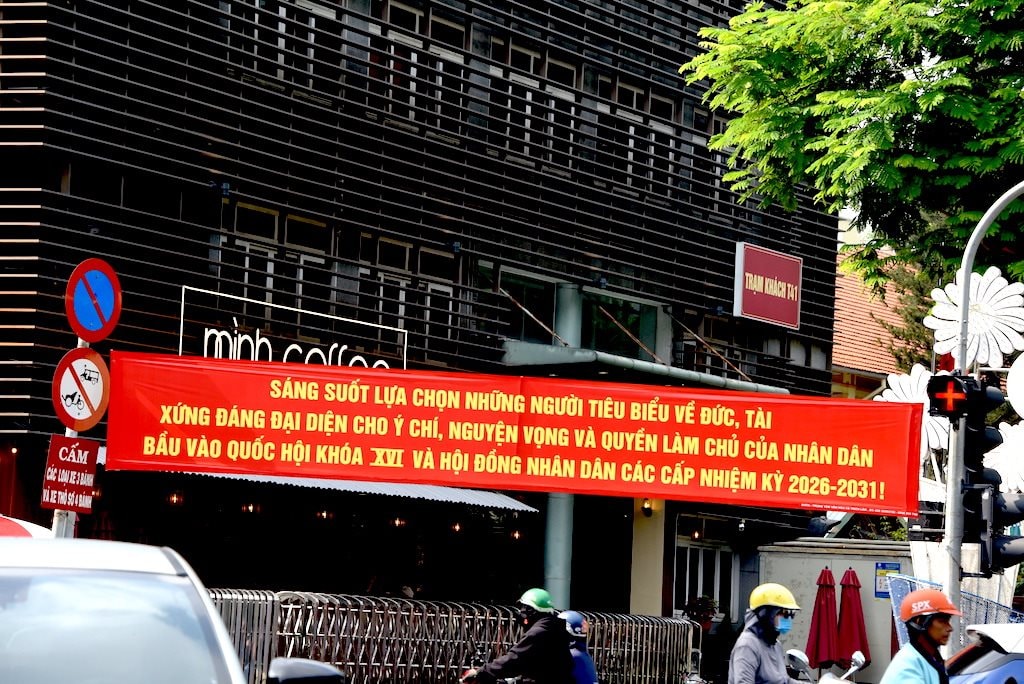 Băng rôn với dòng chữ "Quốc hội khóa XVI hiện thân của trí tuệ, ý chí và nguyện vọng của nhân dân" thể hiện khí thế trước thềm bầu cử.
