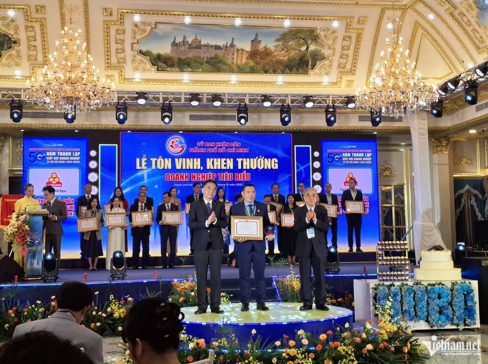 Ông Nguyễn Lộc Hà, Phó Chủ tịch UBND TPHCM (trái) và Chủ tịch HUBA, ông Nguyễn Ngọc Hòa khen thưởng các doanh nghiệp, doanh nhân tiêu biểu tại sự kiện. Ảnh: Trần Chung