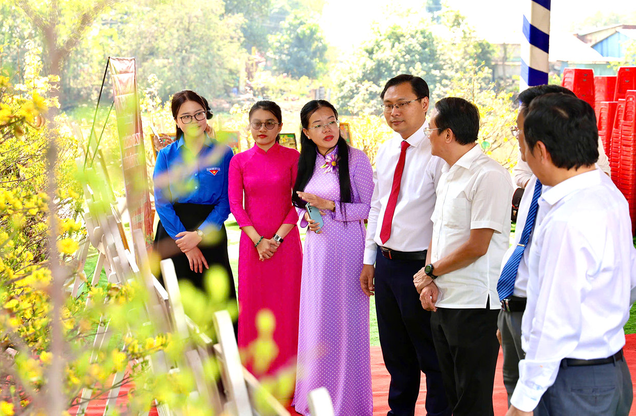 Lãnh đạo địa phương tham quan khu trưng bày mai vàng cùng các hoạt động trong lễ khai mạc đường hoa