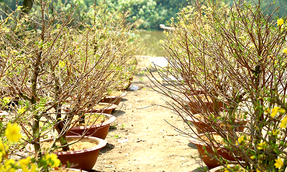 Dọc theo tuyến Vườn Thơm, các cụm tiểu cảnh được bố trí đan xen, vừa tôn vinh vẻ đẹp kiêu sa của loài hoa báo Tết, vừa tái hiện không gian lao động hăng say. Một không gian sống động cho thấy nghề trồng mai bên cạnh kế sinh nhai còn là nét văn hóa thấm đẫm trong nếp sống cộng đồng.