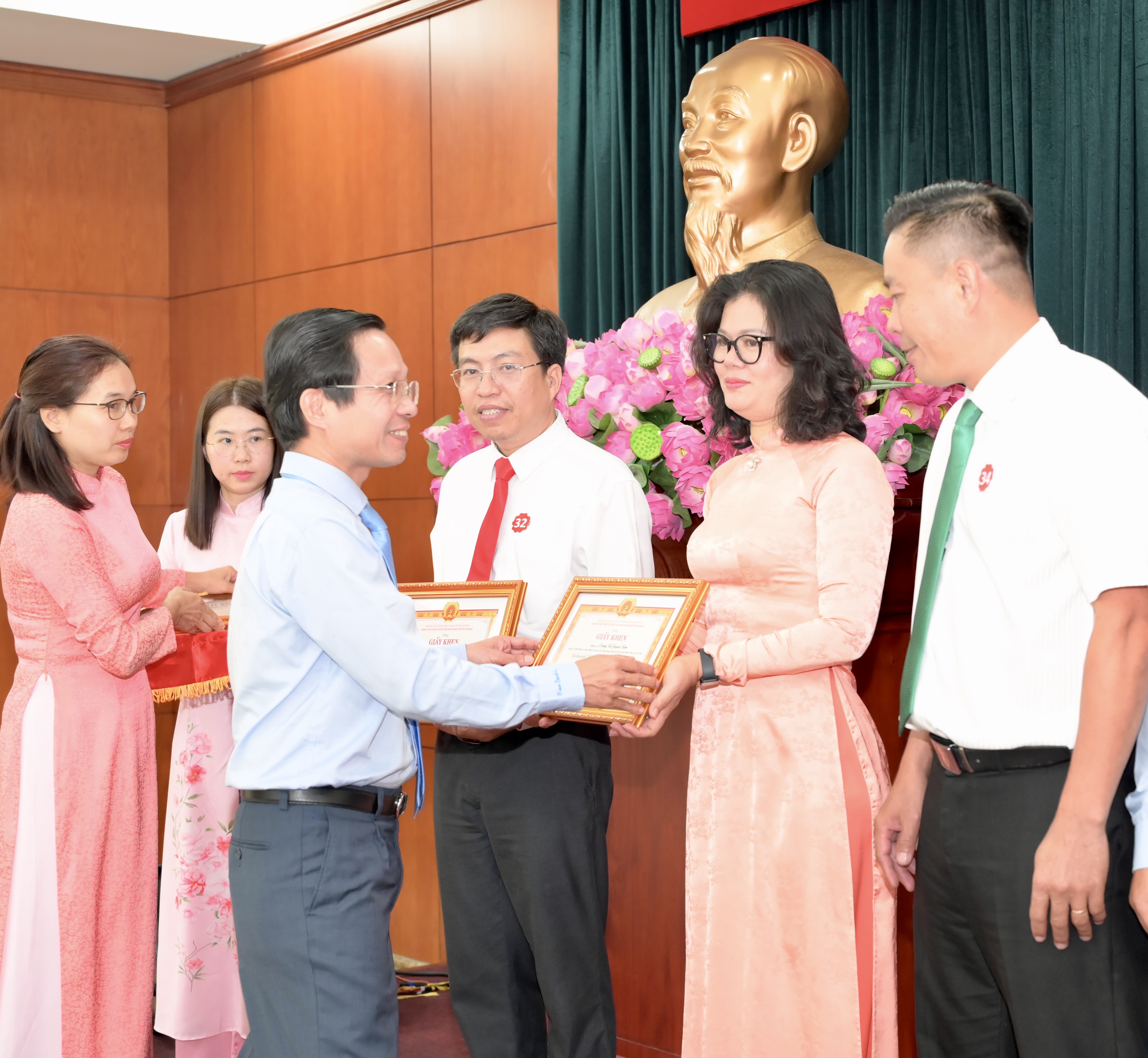 Phó Bí thư Đảng ủy các Cơ quan Đảng TPHCM Lê Văn Phong trao giấy khen. Ảnh: VĂN MINH
