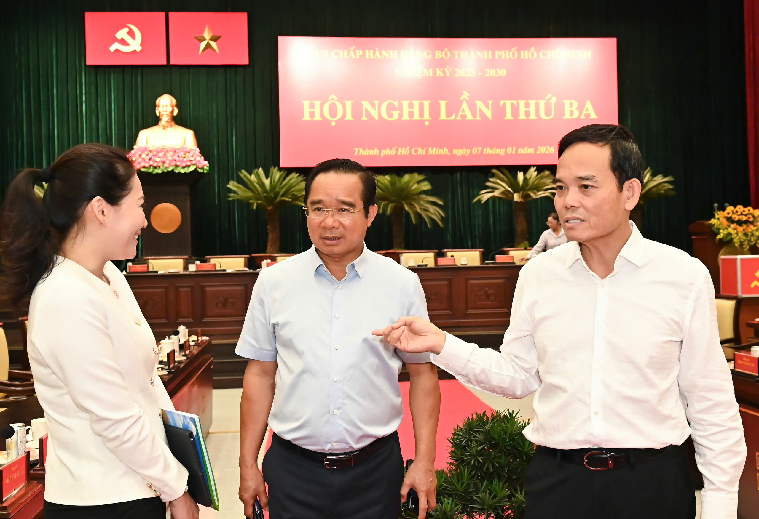 Bí thư Thành ủy TPHCM Trần Lưu Quang trao đổi cùng các đại biểu tại hội nghị. Ảnh VIỆT DŨNG
