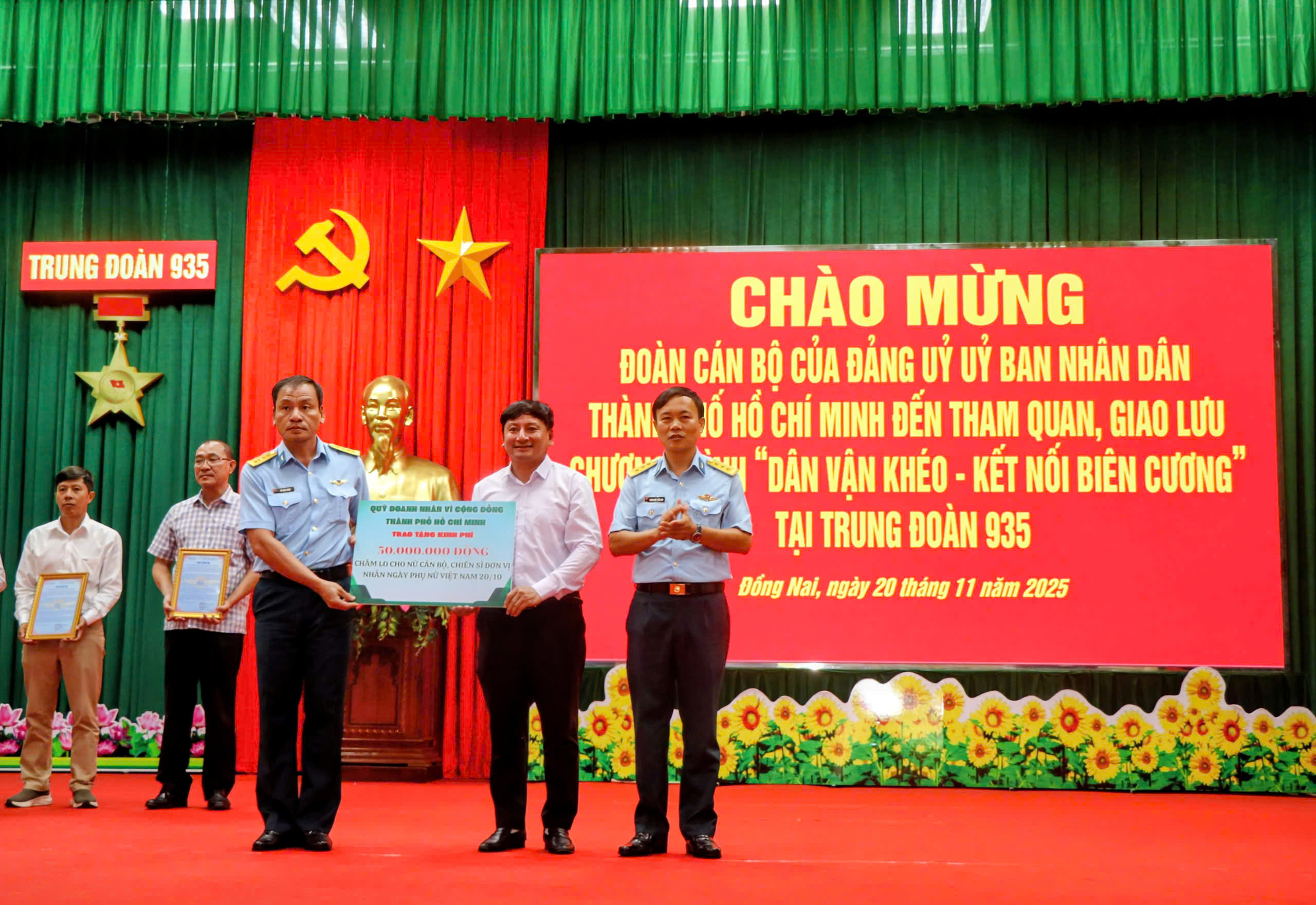Tại chương trình, Đảng ủy UBND TPHCM và các đơn vị đồng hành đã trao tặng Trung đoàn 935 công trình và quà tặng trị giá hơn 300 triệu đồng, trong đó có công trình nước sạch “Tiếp sức những cánh bay” với hệ thống lọc nước RO công suất 1.000 lít/giờ.