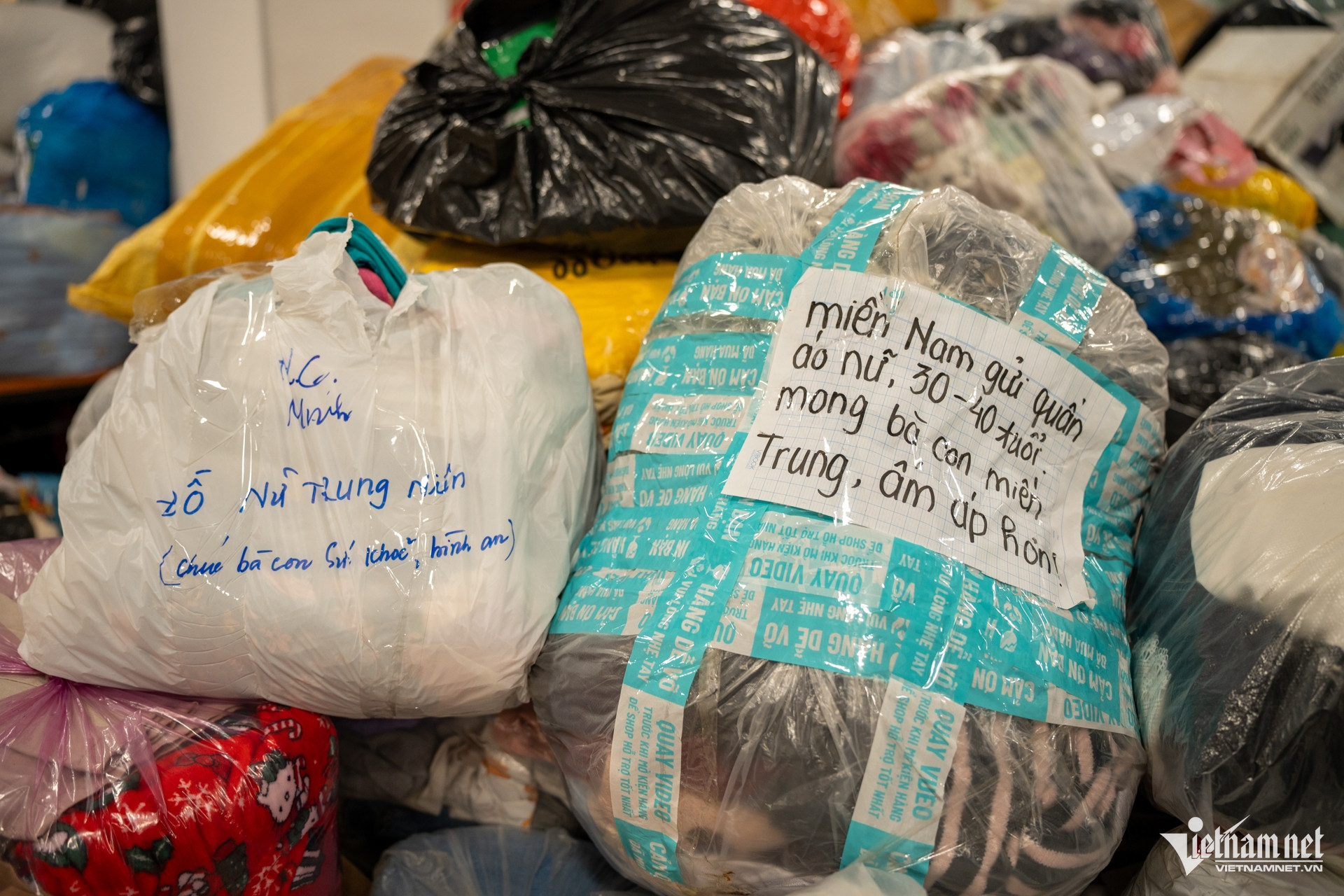 Những túi hàng được kiểm đếm, sắp xếp đầy đủ nhu yếu phẩm, thuốc men và áo phao. Nhiều người cao tuổi cũng tham gia, trong đó có bà Phạm Thị Bạc, 78 tuổi, một giáo viên đã nghỉ hưu. Bàn tay đôi lúc run vì tuổi tác, bà cẩn thận xếp từng món đồ: “Bà con miền Trung khổ quá! Còn sức là tôi còn làm”.