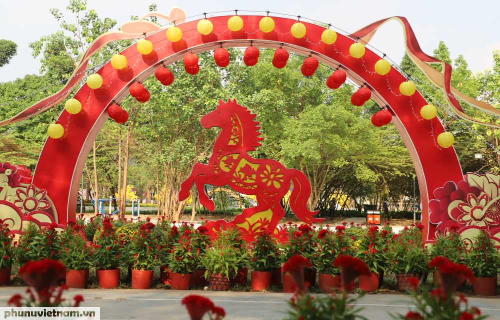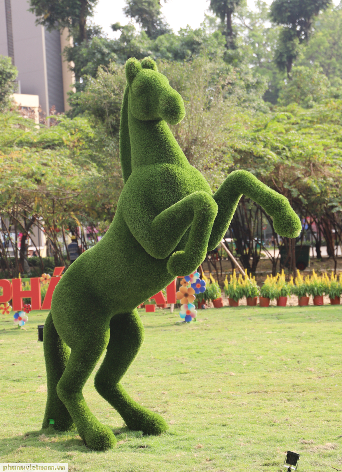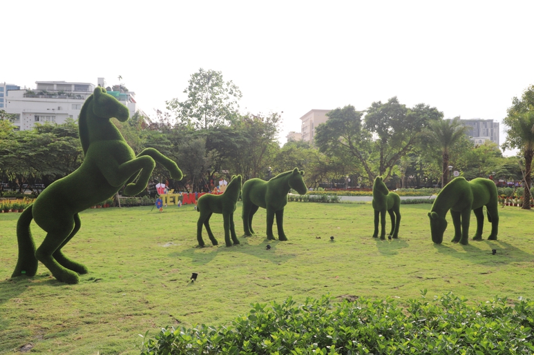 Ngay tại quảng trường trung tâm, bãi cỏ xanh được thiết kế với hình ảnh đàn ngựa - linh vật phục vụ dịp Tết Bính Ngọ 2026