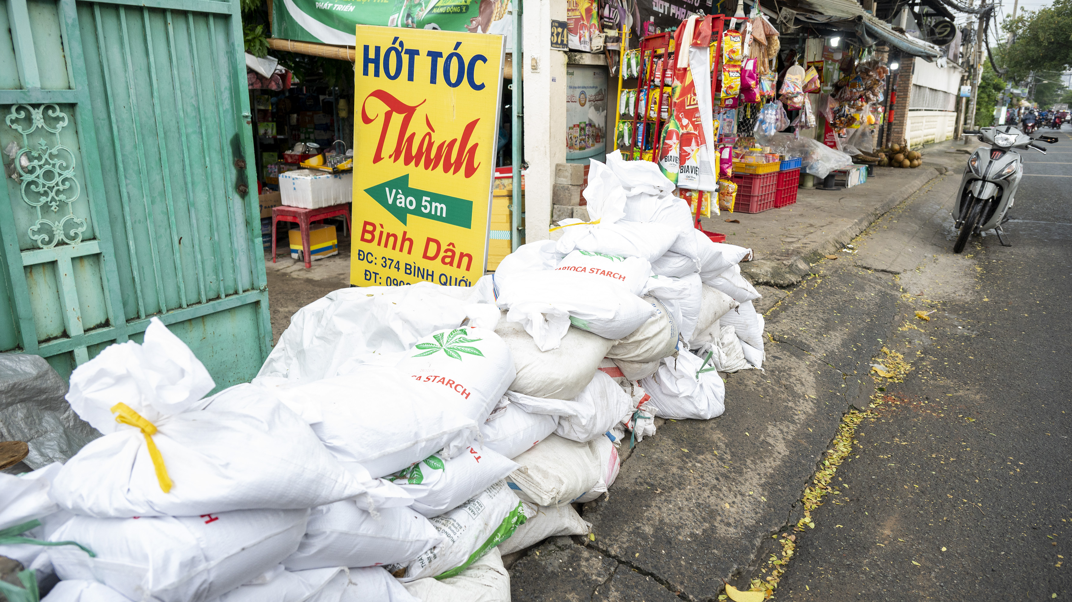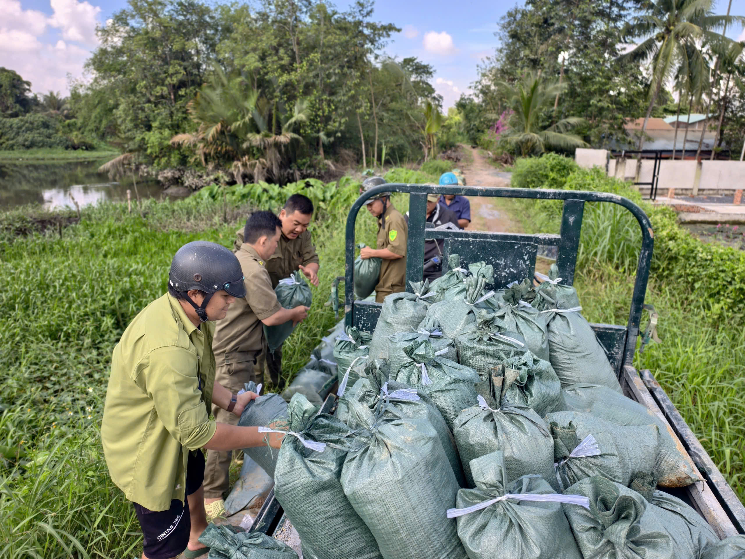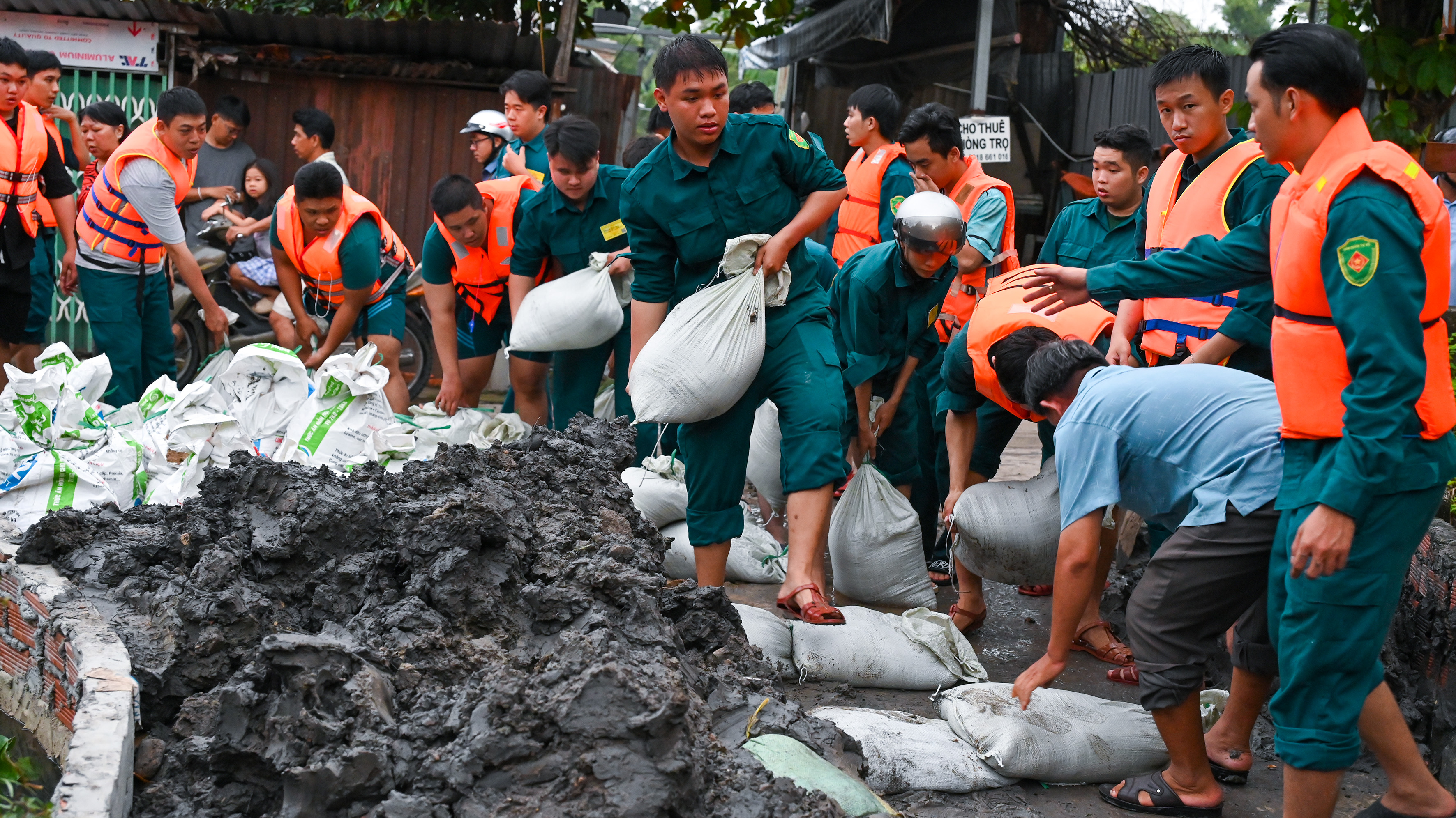 Lực lượng Ban Chỉ huy Quân sự phường Bình Quới, TPHCM khẩn trương vận chuyển các bao cát ngăn triều cường xâm nhập tại các vị trí xung yếu, sáng sớm 5-11