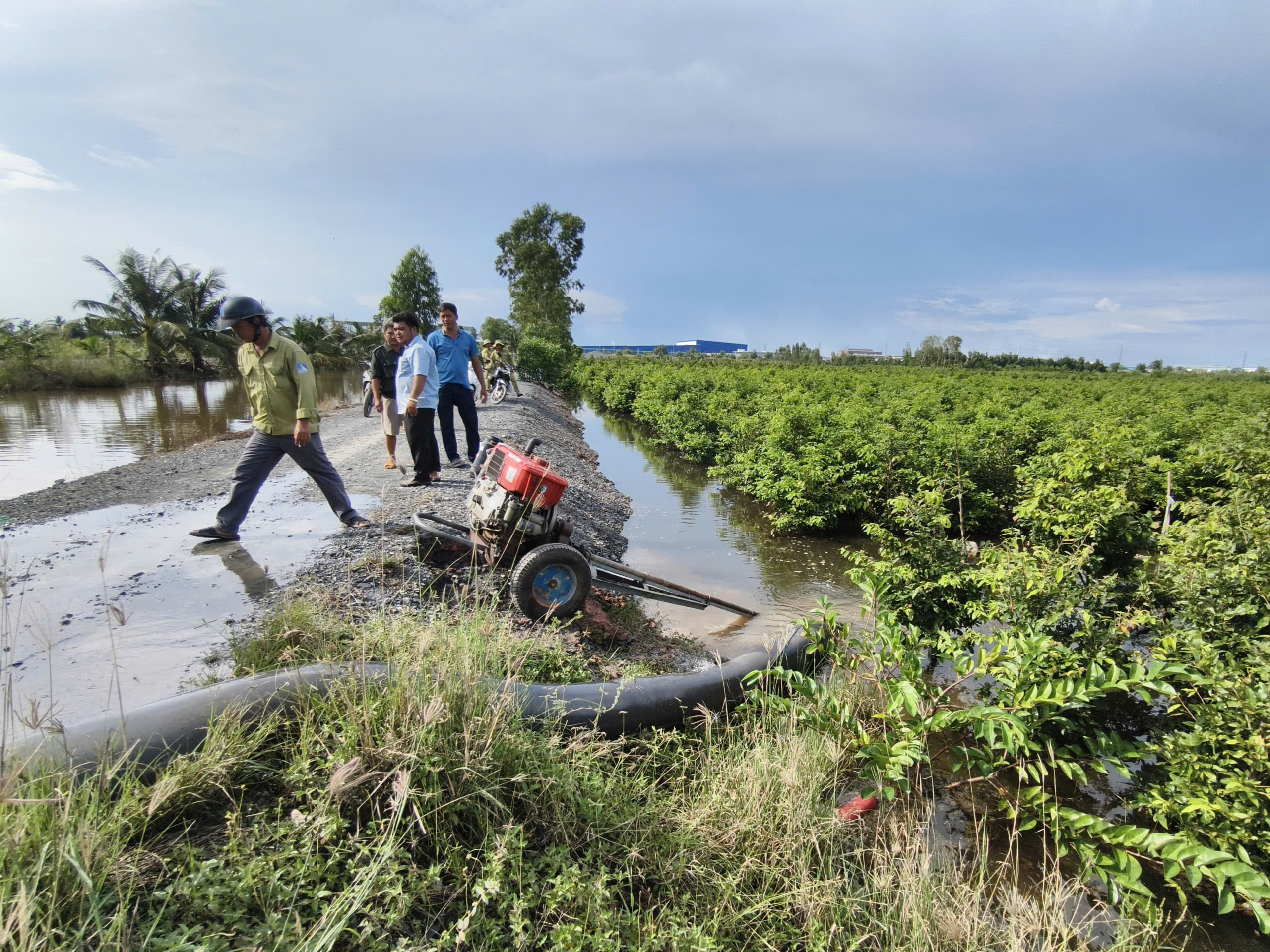 Người và phương tiện hút nước được điều động đến khu vực kênh Tràm Lầy 1, ấp 3, xã Bình Lợi để ứng phó ngập do triều cường và mưa lớn