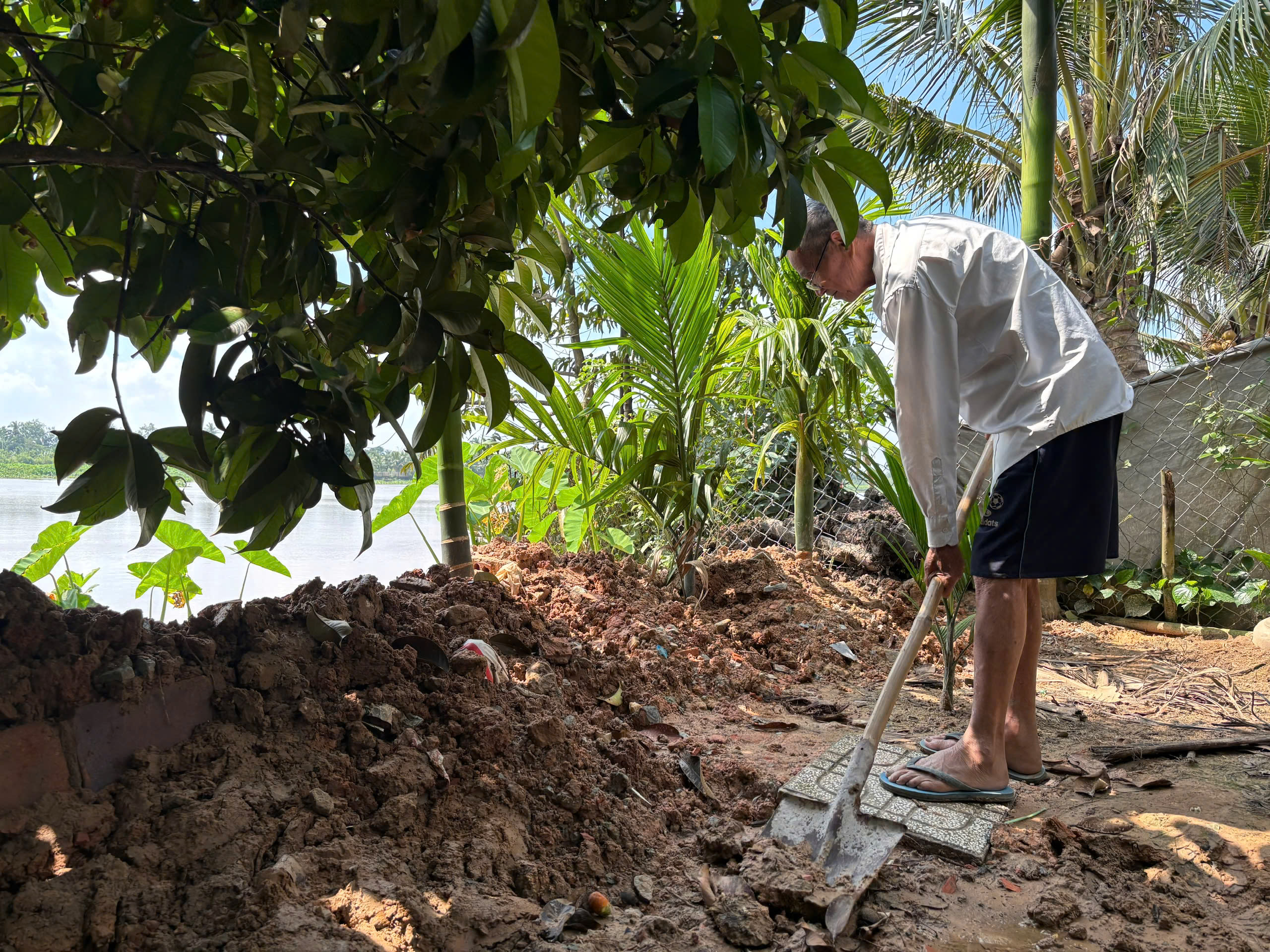 Ông Trần Văn Chính, khu phố An Mỹ, phường Thuận An vác xẻng ra vườn be bờ đối phó triều cường sông Sài Gòn
