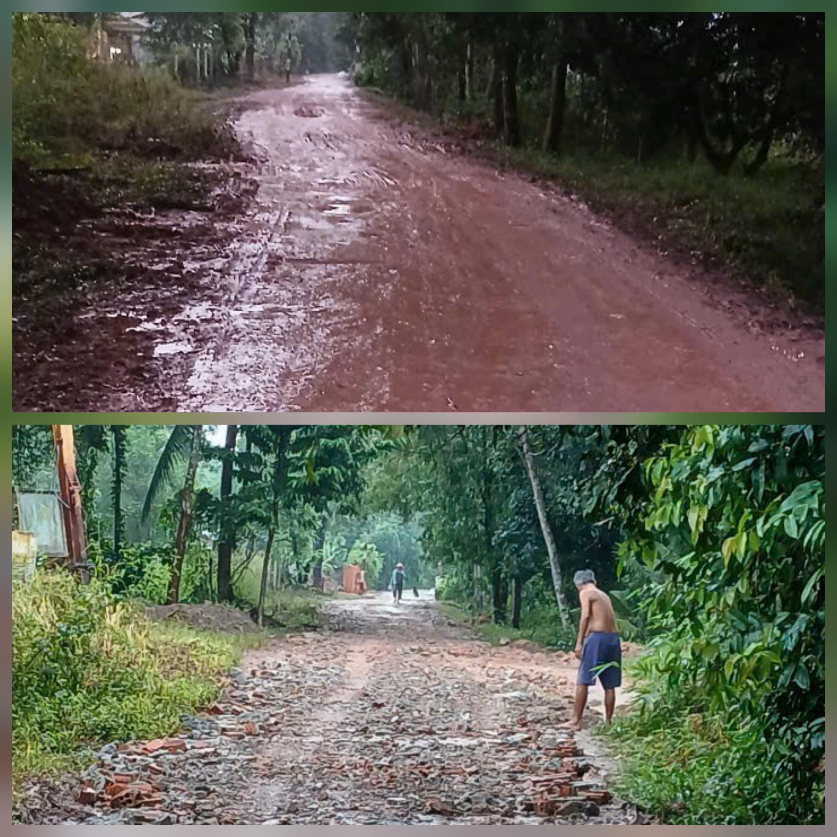 Một tuyến đường gần bờ bao tại khu phố Tân An 2, phường Phú An được người dân góp công, góp tiền gia cố để chống lầy lội. Ảnh trước và sau khi gia cố