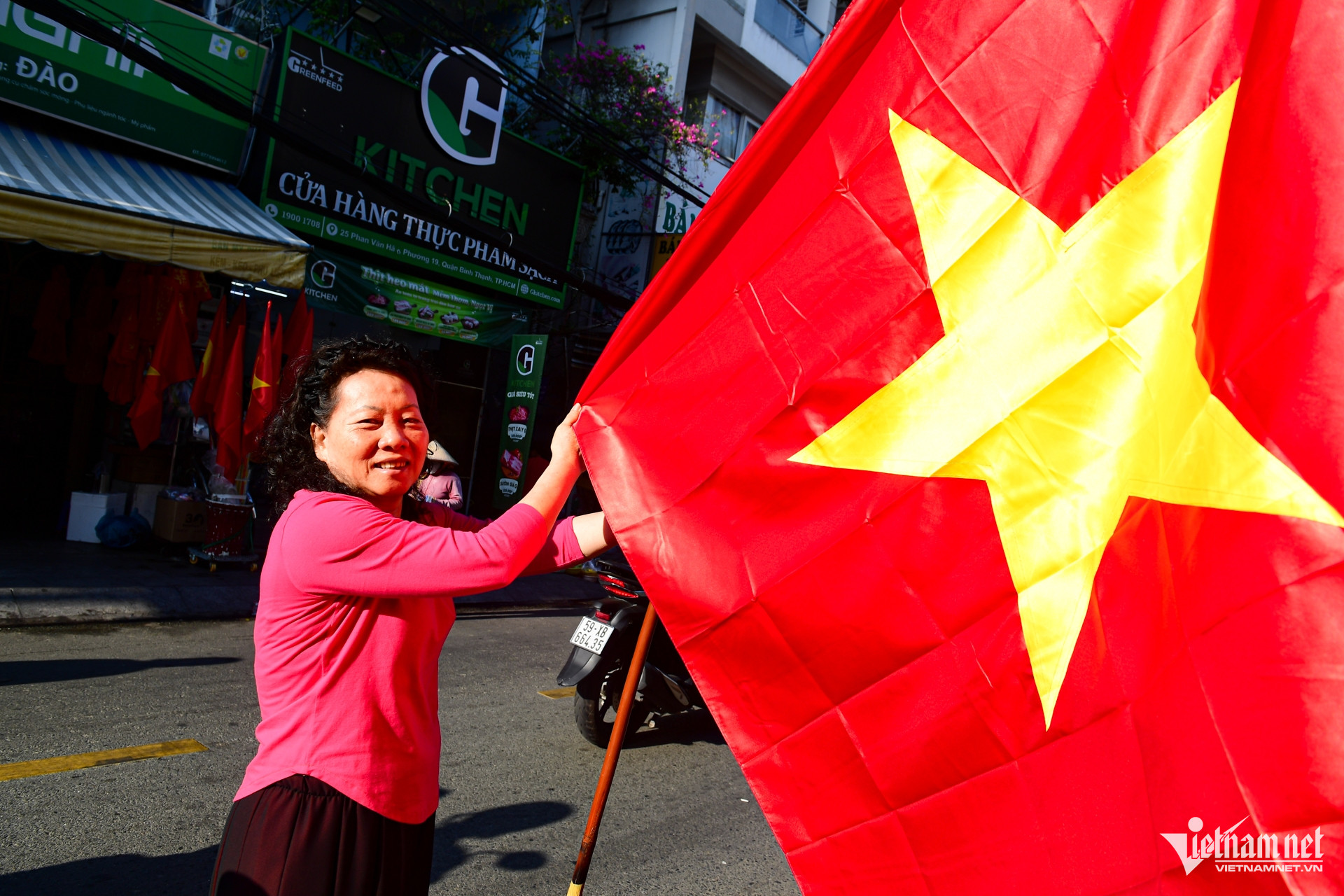 Cô Trần Thị Tuyết (phường Thạnh Mỹ Tây) treo những lá cờ đỏ sao vàng khổ lớn trước cửa hàng với mong muốn tô điểm thêm vẻ đẹp và tình yêu quê hương đất nước.