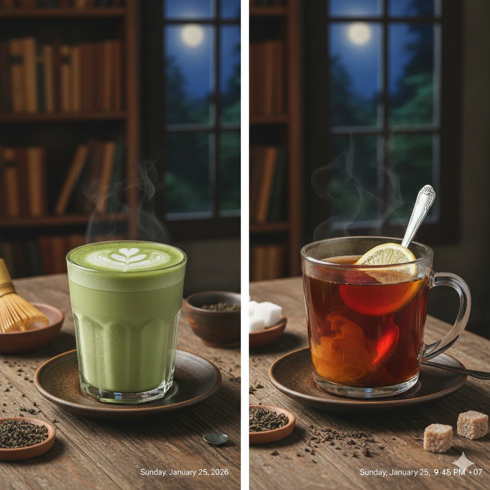 Trà xanh mang lại sự tỉnh táo nhẹ nhàng hơn với khoảng 37 mg caffeine cho mỗi 350 ml. Trà xanh còn chứa L-theanine giúp tập trung ổn định và không gây suy giảm năng lượng đột ngột. Tuy nhiên, tiêu thụ quá nhiều caffeine có thể gây bồn chồn, lo lắng hoặc khó ngủ.