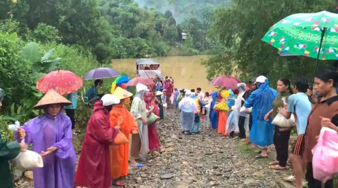 Tại các thôn vùng ngập, người dân cùng lực lượng chức năng đội mưa, lập hàng dài chuyền tay nhau vận chuyển hàng cứu trợ. Trong điều kiện thời tiết khắc nghiệt, mưa lớn và nước xiết, mọi người nỗ lực đưa nhu yếu phẩm đến từng hộ dân bị cô lập.