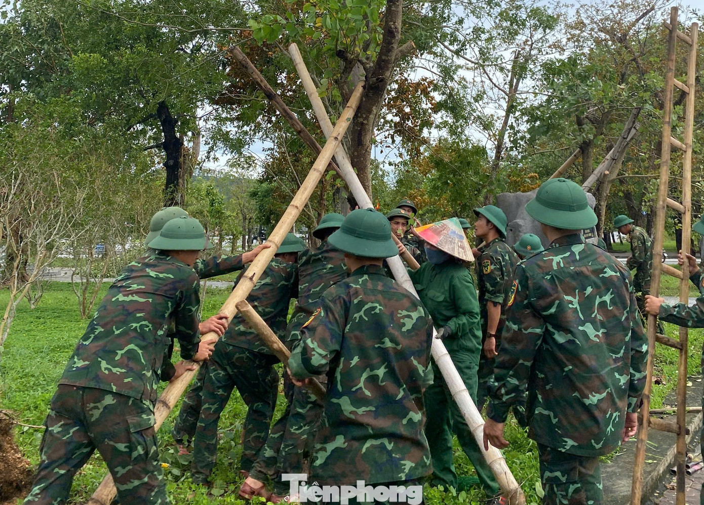 Những cây bị đổ được các cán bộ chiến sĩ đào để trồng lại.