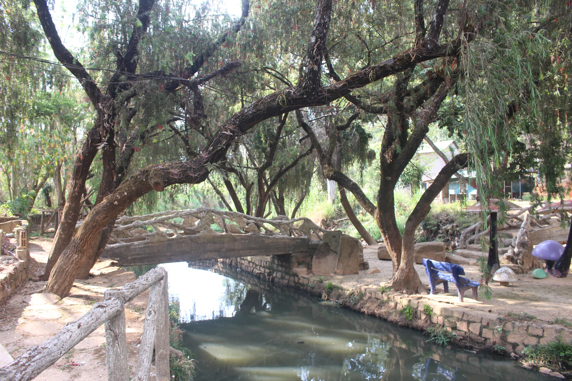 Cây cầu bắc qua dòng nước đen ngòm dưới chân thác