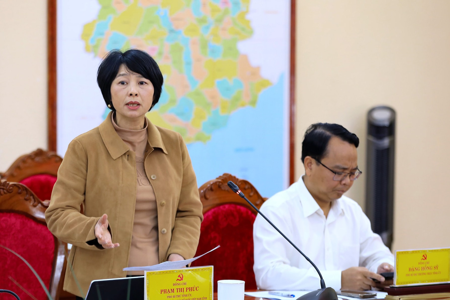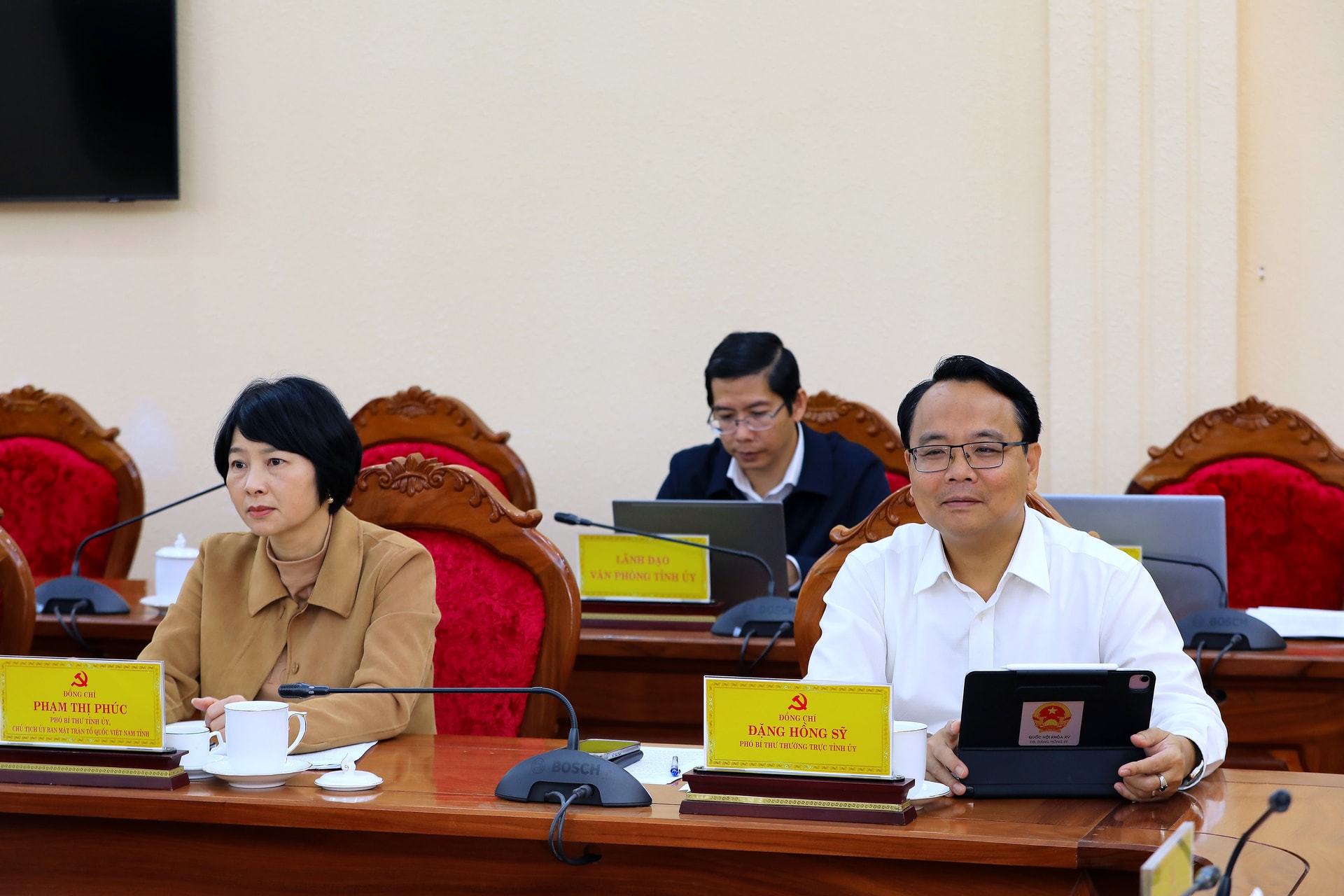 Phó Bí thư Thường trực Tỉnh ủy Lâm Đồng Đặng Hồng Sỹ và Phó Bí thư Tỉnh ủy, Chủ tịch Ủy ban MTTQ Việt Nam tỉnh Lâm Đồng Phạm Thị Phúc dự hội nghị