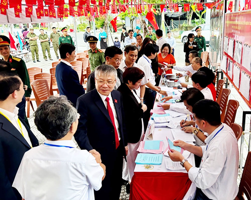 Không khí sôi nổi, phấn khởi tại Khu vực bỏ phiếu số 2, nhà sinh hoạt cộng đồng Khu dân cư số 25, phường Hòa Xuân, TP. Đà Nẵng. Ảnh: Văn Phong