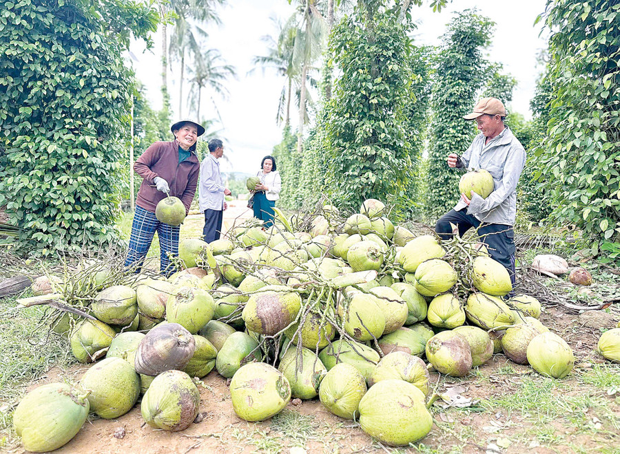 Tại xã Hoài Ân, những ngày này, hình ảnh nông dân thu hoạch dừa xiêm, bưởi da xanh diễn ra liên tục để kịp cung ứng cho thị trường Tết. Ông Đặng Văn Cấp (thôn Thạch Long 1) cho biết, gia đình ông đang canh tác 4 ha bưởi và hơn 1 ha dừa xiêm theo hướng hữu cơ và VietGAP. Nhờ sản xuất đúng quy trình, sản phẩm được thị trường ưa chuộng.