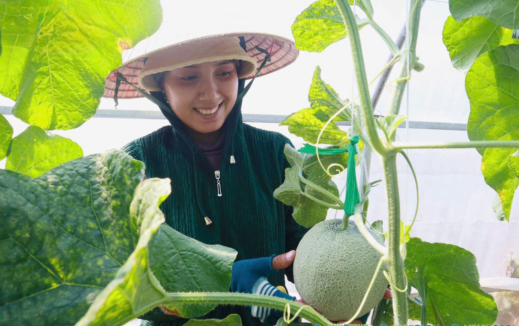 Chị Đạo Thị Đã, nhân viên tại trang trại, cho biết đơn vị này thực hiện khắc chữ trực tiếp bằng tay lên vỏ dưa lưới giống Hoàng Long và TN3, thay vì dán chữ như nhiều nơi khác.