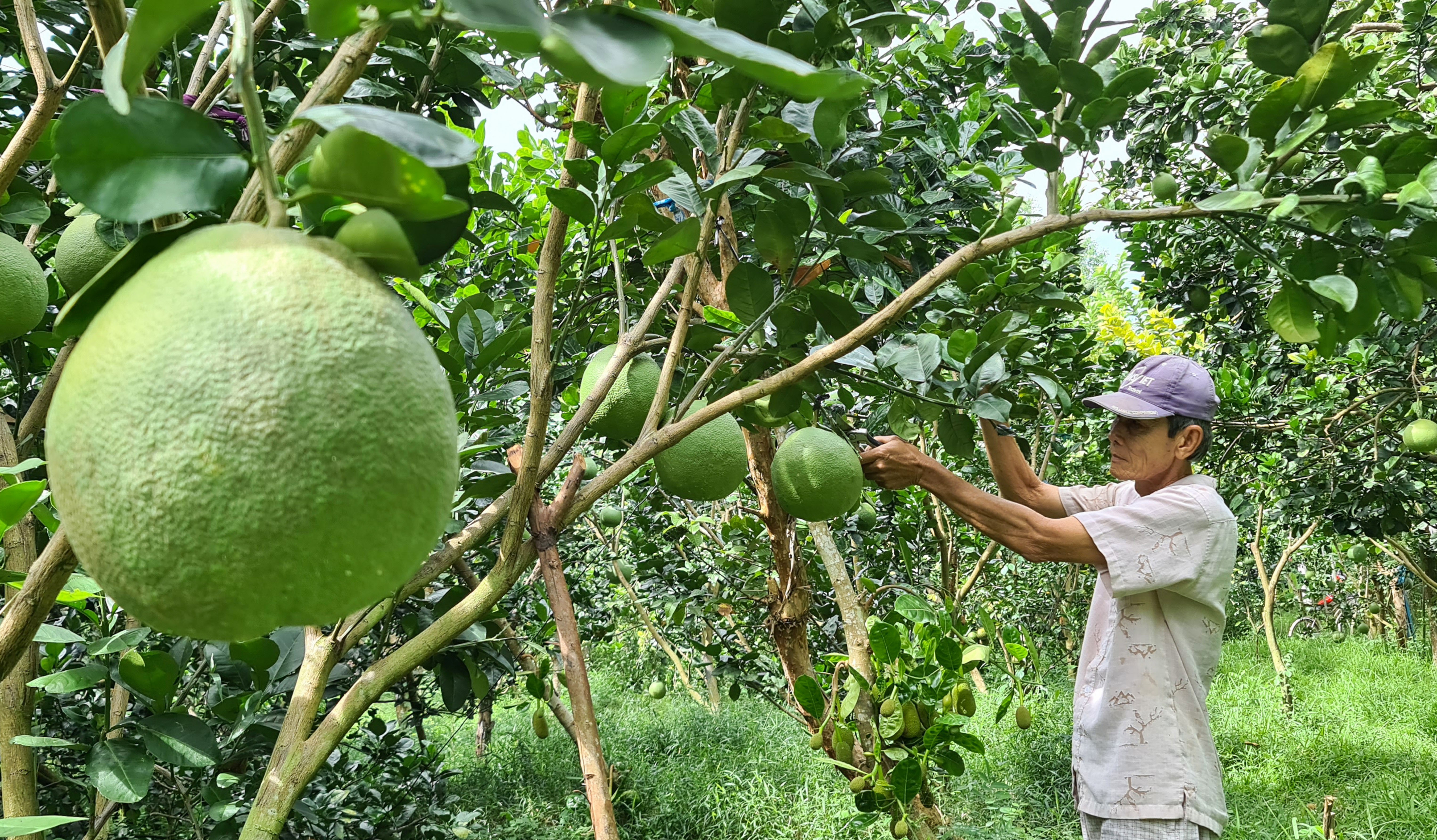 Nông dân xã Cái Bè, tỉnh Đồng Tháp chăm sóc vườn bưởi trồng theo tiêu chuẩn VietGAP. ẢNH: NGỌC PHÚC