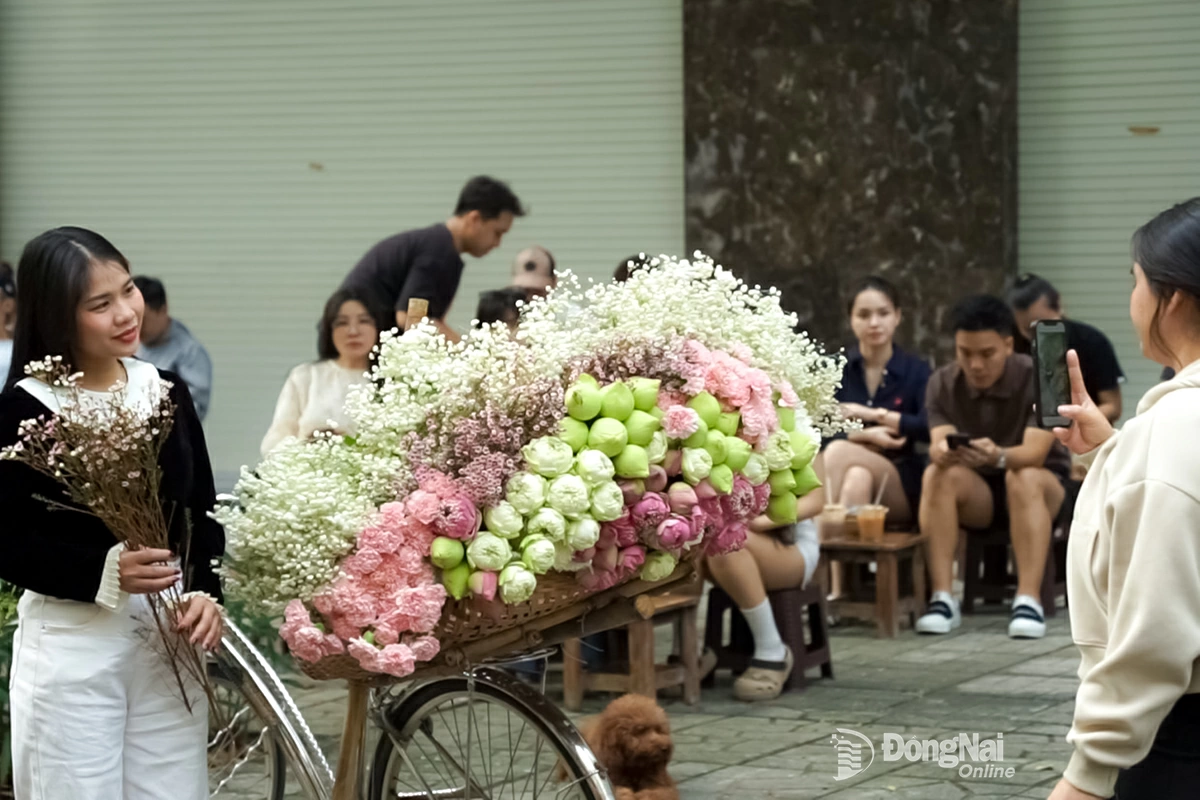 Các bạn trẻ Đồng Nai chụp ảnh cùng xe đạp hoa mang sắc hương Hà Nội tại một quán cà phê ở phường Trấn Biên, tỉnh Đồng Nai. Ảnh: Lê Duy