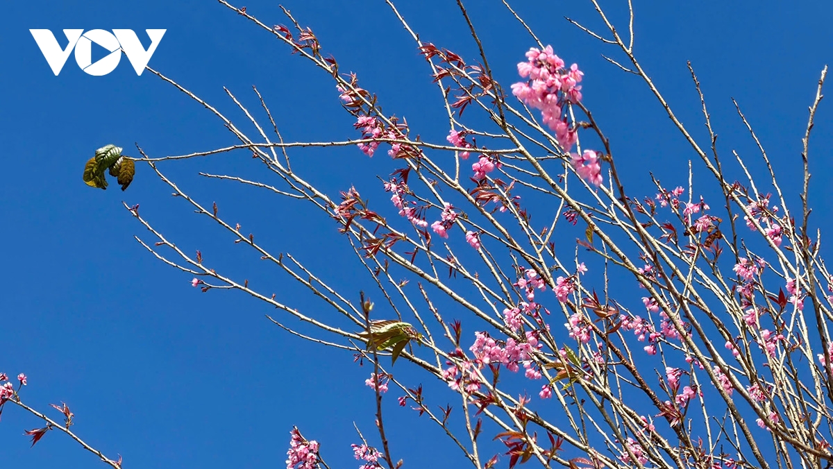 Những cành Mai Anh Đào bung nở trong nắng xuân, nổi bật trên nền trời xanh, mang vẻ đẹp dịu dàng, tinh khôi – dấu hiệu quen thuộc báo mùa xuân về trên cao nguyên Đà Lạt.