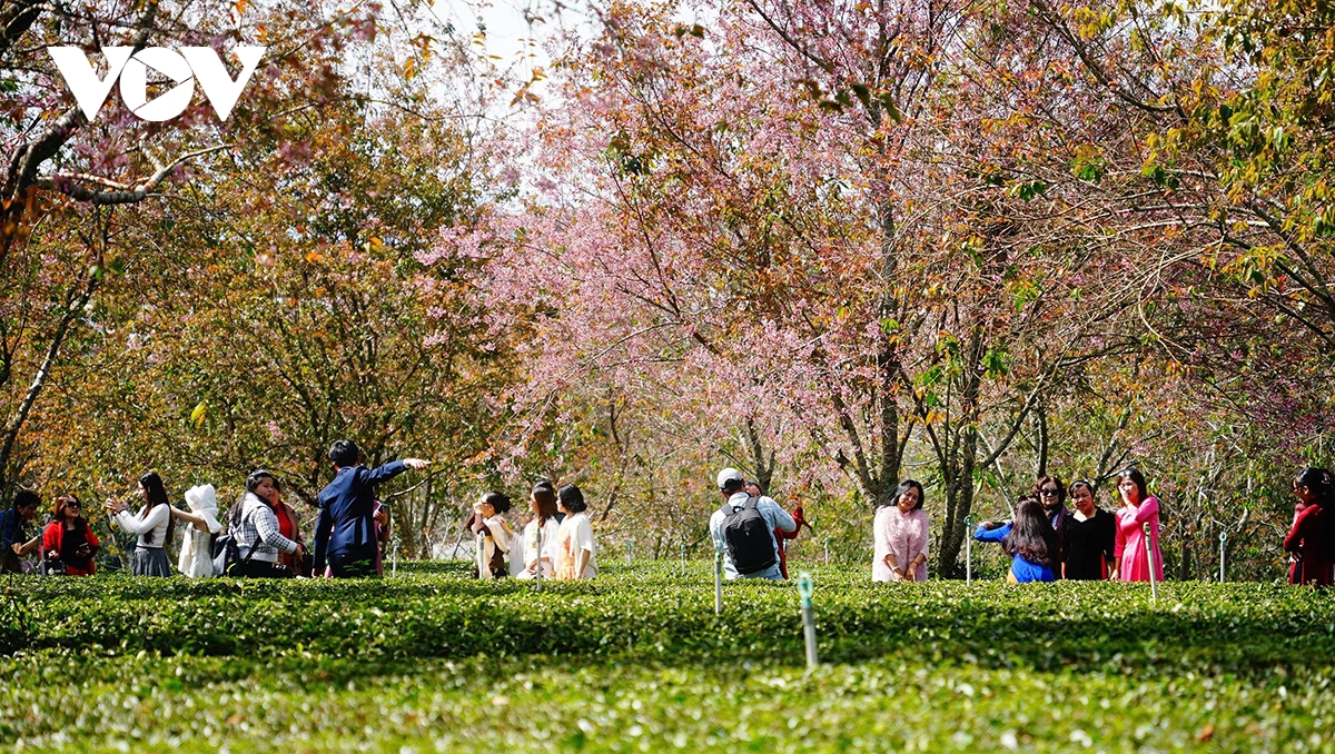 Du khách thích thú tạo dáng, chụp ảnh bên những cành mai anh đào nở rộ, ghi lại khoảnh khắc thư thái, an yên giữa không gian đồi trà, góp phần lan tỏa hình ảnh Đà Lạt thân thiện, hấp dẫn trong mùa lễ hội.