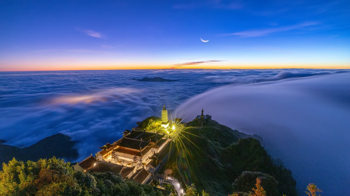 Không chỉ có vẻ đẹp thiên nhiên, Fansipan còn là điểm đến tâm linh linh thiêng bậc nhất Tây Bắc. Giữa không gian mây phủ là quần thể kiến trúc đồ sộ với Đại tượng Phật A Di Đà uy nghiêm, tượng Quan Thế Âm Bồ Tát khoan thai, cùng Thiền viện Bích Vân tĩnh tại. Tiếng chuông chùa ngân vang giữa tầng mây khiến tâm hồn người nghe như được gột rửa, tìm về sự an nhiên hiếm có giữa đất trời bao la.