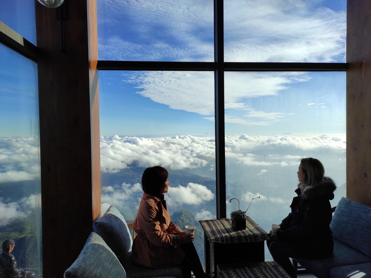 Khoảng 15 phút sau, khi cánh cửa cabin mở ra, một không gian hoàn toàn khác hiện trước mắt – mây phủ kín đất trời, gió núi mơn man và ánh nắng trong veo tràn xuống. Ảnh Hoàng Trung Hiếu