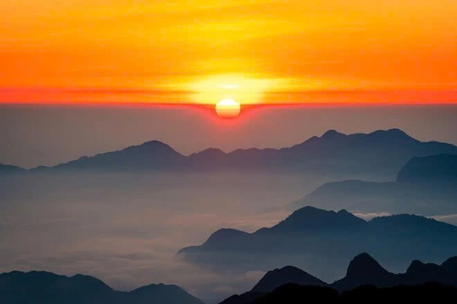 Fansipan đẹp nhất vào hai thời khắc đối lập: bình minh và hoàng hôn. Khi mặt trời nhô lên, biển mây chuyển màu vàng rực, lấp lánh như sóng ánh sáng đang nhảy múa giữa bầu trời. Ảnh Hoàng Trung Hiếu