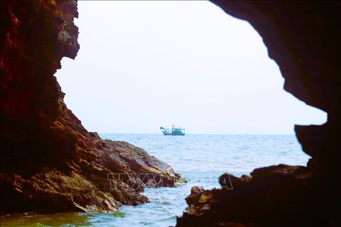 Tàu thuyền của ngư dân xã Quỳnh Phú (tỉnh Nghệ An) đi qua khu vực hang Mũi Trâu. Ảnh: Xuân Tiến/TTXVN